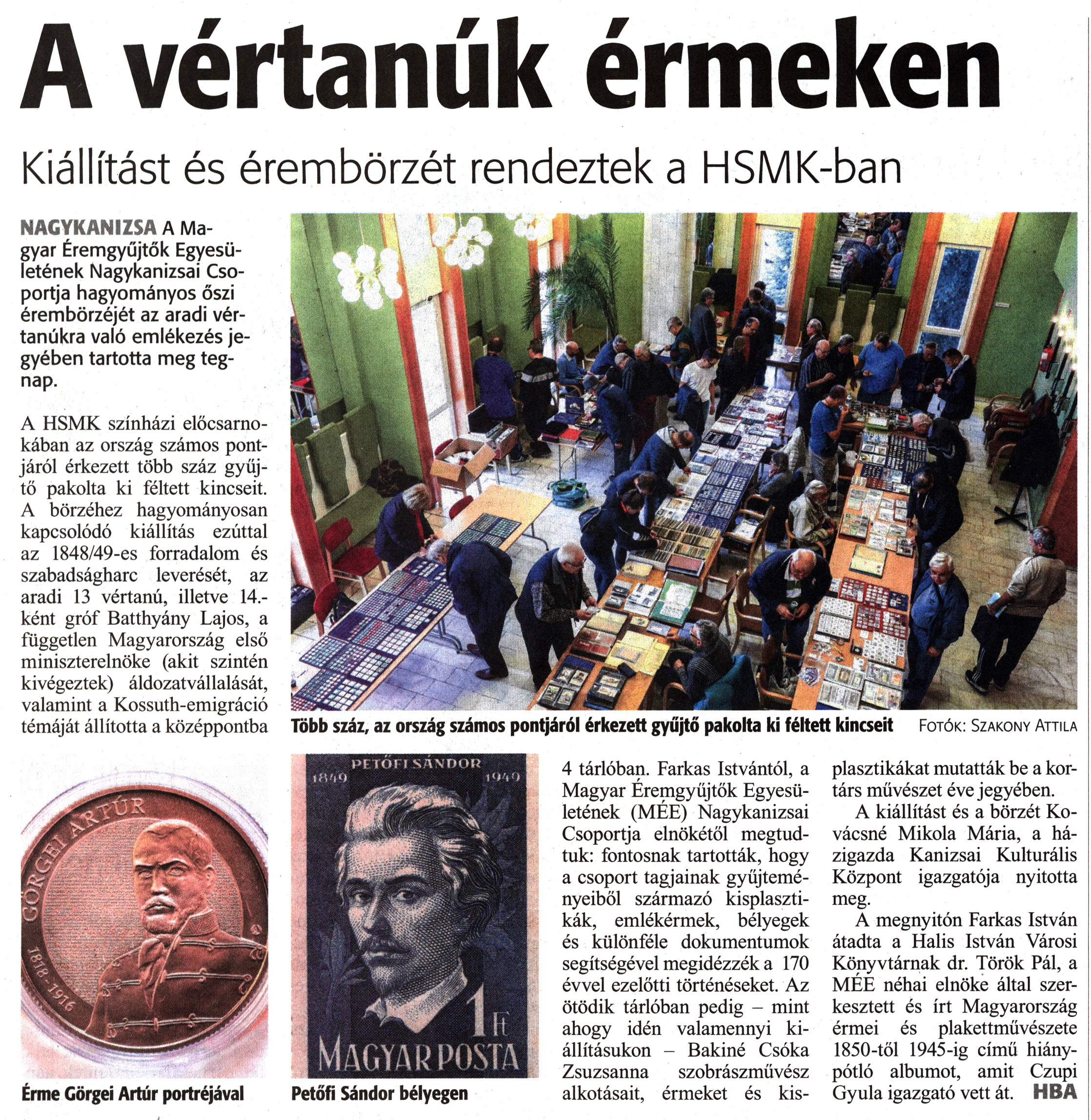 Nyilvános 1281 | 1993 | Zalai Hírlap 2019. november 4. 255. szám 3. oldal - A vértanúk érmeken | A vértanúk érmeken Kiállítást és érembörzét rendeztek a HSMK-ban NAGYKANIZSA A Magyar Éremgyűjtők Egyesületének Nagykanizsai Csoportja hagyományos őszi érembörzéjét az aradi vértanúkra való emlékezés jegyében tartotta meg tegnap. A HSMK színházi előcsarnokában az ország számos pontjáról érkezett több száz gyűjtő pakolta ki féltett kincseit. A börzéhez hagyományosan kapcsolódó kiállítás ezúttal az 1848/49-es forradalom és szabadságharc leverését, az aradi 13 vértanú, illetve 14.-ként gróf Batthyány Lajos, a független Magyarország első miniszterelnöke (akit szintén kivégeztek) áldozatvállalását, valamint a Kossuth-emigráció témáját állította a középpontba 4 tárlóban. Farkas Istvántól, a Magyar Éremgyüjtők Egyesületének (MÉE) Nagykanizsai Csoportja elnökétől megtudtuk: fontosnak tartották, hogy a csoport tagjainak gyűjteményeiből származó kisplasztikák, emlékérmek, bélyegek és különféle dokumentumok segítségével megidézzék a 170 évvel ezelőtti történéseket. Az ötödik tárlóban pedig - mint ahogy idén valamennyi kiállításukon - Bakiné Csóka Zsuzsanna szobrászművész alkotásait, érmeket és kisplasztikákat mutatták be a kortárs művészet éve jegyében. A kiállítást és a börzét Kovácsné Mikola Mária, a házigazda Kanizsai Kulturális Központ igazgatója nyitotta meg. A megnyitón Farkas István átadta a Halis István Városi Könyvtárnak dr. Török Pál, a MÉE néhai elnöke által szerkesztett és írt Magyarország érmei és plakettművészete 1850-től 1945-ig című hiánypótló albumot, amit Czupi Gyula igazgató vett át. HBA Érme Görgei Artúr portréjával Petőfi Sándor bélyegen Több száz, az ország számos pontjáról érkezett gyűjtő pakolta ki féltett kincseit Fotók: Szakony Attila |
