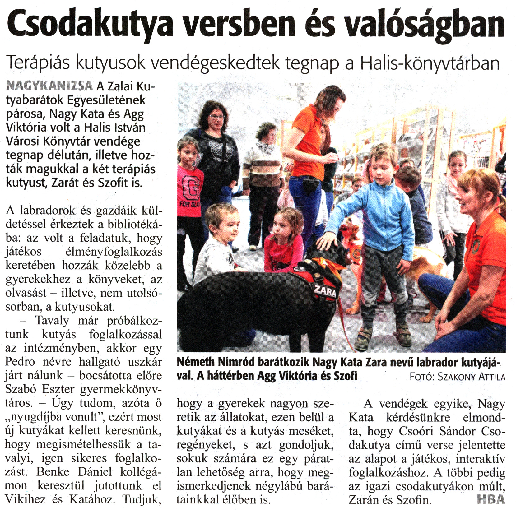 Nyilvános 1274 | 1961 | Zalai Hírlap 2020. február 29. 51. szám 3. oldal | Csodakutya versben és valóságban Terápiás kutyusok vendégeskedtek tegnap a Halis-könyvtárban Németh Nimród barátkozik Nagy Kata Zara nevű labrador kutyájával. A háttérben Agg Viktória és Szofi Fotó: Szakony Attila NAGYKANIZSA A Zalai Kutyabarátok Egyesületének párosa, Nagy Kata és Agg Viktória volt a Halis István Városi Könyvtár vendége tegnap délután, illetve hozták magukkal a két terápiás kutyust, Zarát és Szofit is. A labradorok és gazdáik küldetéssel érkeztek a bibliotékába: az volt a feladatuk, hogy játékos élményfoglalkozás keretében hozzák közelebb a gyerekekhez a könyveket, az olvasást - illetve, nem utolsósorban, a kutyusokat. - Tavaly már próbálkoztunk kutyás foglalkozással az intézményben, akkor egy Pedro névre hallgató uszkár járt nálunk - bocsátotta előre Szabó Eszter gyermekkönyvtáros. - Úgy tudom, azóta ő „nyugdíjba vonult", ezért most új kutyákat kellett keresnünk, hogy megismételhessük a tavalyi, igen sikeres foglalkozást. Benke Dániel kollégámon keresztül jutottunk el Vikihez és Katához. Tudjuk, hogy a gyerekek nagyon szeretik az állatokat, ezen belül a kutyákat és a kutyás meséket, regényeket, s azt gondoljuk, sokuk számára ez egy páratlan lehetőség arra, hogy megismerkedjenek négylábú barátainkkal élőben is. A vendégek egyike, Nagy Kata kérdésünkre elmondta, hogy Csoóri Sándor Csodakutya című verse jelentette az alapot a játékos, interaktív foglalkozáshoz. A többi pedig az igazi csodakutyákon múlt, Zarán és Szofin. HBA |