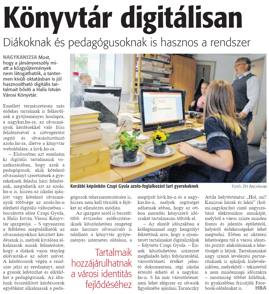 Nyilvános 1254 | 1896 | Könyvtár digitálisan | Diákoknak és pedagógusoknak is hasznos a rendszer Korábbi képünkön Czupi Gyula azolo-foglalkozást tart gyerekeknek Fotó: ZH Archívum NAGYKANIZSA Most, hogy a járványveszély miatt a közgyűjtemények nem látogathatók, a tantermen kívüli oktatásban is jól hasznosítható digitális tartalmait bővíti a Halis István Városi Könyvtár. Emellett természetesen más érdekes tartalmak is felkerülnek a gyűjteményes honlapra, a nagykar.hu-ra, az olvasmányok kérdésekkel való friss felidézésével a szövegértést segítő és olvasásösztönzö azolo.hu-ra, illetve a könyvtár weboldalára, a hivk.hu-ra. - Elsősorban azt emelném ki digitális tartalmaink vonatkozásában, hogy azok a pedagógusok, akik kötelező olvasmányt szeretnének a gyerekeknek feladni házi feladatnak, megtehetik ezt az azolo.hu-n is, hiszen az iskolai ajánlott vagy kötelező olvasmányok többsége az azolo.hu-n elérhető digitális változatban -bocsátotta előre Czupi Gyula, a Halis István Városi Könyvtár igazgatója. - S ugyanezen a felületen megtalálhatók az olvasmányokhoz készített kérdéseink is, melyek kiválóan alkalmasak annak felmérésére, hogy a diákok vajon tényleg elolvasták-e az adott művet. A kérdéssorok végén a rend-szer jelzi az eredményt, amit a gyerek lefotózhat és elküldhet a pedagógusnak. Az általunk összeállított kérdéssorok egyébként alkalmasak a pedagógusok tehermentesítésére is, hiszen nem kell törniük a fejüket az ellenőrzés módján. Az igazgató arról is beszélt: több évtizedes erőfeszítéseiknek köszönhetően rengeteg más hasznos olvasnivaló is található a könyvtár gyűjteményes internetes oldalain, a megújult hivk.hu-n és a nagykar.hu-n, melyek segítséget adhatnak abban, hogy az otthon maradás kényszerű időszakát tartalmasai! töltsük el. - Az elmúlt időszakban a kollégáimmal nagy hangsúlyt fektettünk arra, hogy a nyomtatott tartalmakat digitalizáljuk - folytatta Czupi Gyula. - Ennek köszönhetően százezret meghaladó helyi folyóiratoldal, várostörténeti értéket jelentő dokumentum, régi iskolai értesítő érhető el a nagykar.hu-n. S ha már várostörténet: nem lehet elégszer az olvasók figyelmébe ajánlani Tarnóczky Attila helytörténész "Hol, mi? Kanizsai házak és lakói" (hol-mi.nagykar.hu) című nagyszabású elektronikus munkáját, melyből a város szinte minden fontos és jelentős épületéről, helyéről érdekességeket lehet megtudni. Ebben az oktatási lehetőségen túl a városi identitás pozitív alakulásának a lehetőségét is látjuk. Tartalmainkat nagy számú levelezési partnerünknek is ajánljuk hírleveleinkben. melyekből - tekintettel a nem mindennapi időszakra - mostanság többet küldünk, és gyakrabban frissítjük Facebook-oldalunkat is. HBA |