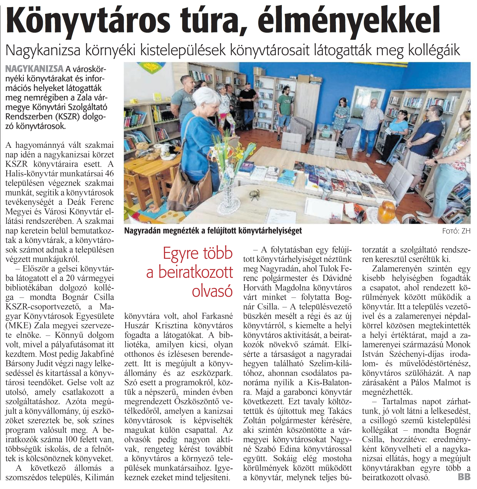 Nyilvános 831 | 1176 | Zalai Hírlap 2024. július 12. 161. szám 2. oldal | Könyvtáros túra, élményekkel NAGYKANIZSA A városkörnyéki könyvtárakat és információs helyeket látogatták meg nemrégiben a Zala vármegye Könyvtári Szolgáltató Rendszerben (KSZR) dolgozó könyvtárosok. A hagyománnyá vált szakmai nap idén a nagykanizsai körzet KSZR könyvtáraira esett. A Halis-könyvtár munkatársai 46 településen végeznek szakmai munkát, segítik a könyvtárosok tevékenységét a Deák Ferenc Megyei és Városi Könyvtár ellátási rendszerében. A szakmai nap keretein belül bemutatkoztak a könyvtárak, a könyvtárosok számot adnak a településen végzett munkájukról. - Először a gelsei könyvtárba látogatott el a 20 vármegyei bibliotékában dolgozó kolléga - mondta Bognár Csilla KSZR-csoportvezető, a Magyar Könyvtárosok Egyesülete (MKE) Zala megyei szervezete elnöke. - Könnyű dolgom volt, mivel a pályafutásomat itt kezdtem. Most pedig Jakabfiné Bársony Judit végzi nagy lelkesedéssel és kitartással a könyvtárosi teendőket. Gelse volt az utolsó, amely csatlakozott a szolgáltatáshoz. Azóta megújult a könyvállomány, új eszközöket szereztek be, sok színes program valósult meg. A beiratkozok száma 100 felett van, többségük iskolás, de a felnőttek is kölcsönöznek könyveket. A következő állomás a szomszédos település, Kilimán könyvtára volt, ahol Farkasné Huszár Krisztina könyvtáros fogadta a látogatókat. A bibliotéka, amilyen kicsi, olyan otthonos és ízlésesen berendezett. Itt is megújult a könyvállomány és az eszközpark. Szó esett a programokról, köztük a népszerű, minden évben megrendezett Oszköszöntő vetélkedőről, amelyen a kanizsai könyvtárosok is képviselték magukat külön csapattal. Az olvasók pedig nagyon aktívak, rengeteg kérést továbbít a könyvtáros a környező települések munkatársaihoz. Igyekeznek ezeket mind teljesíteni. - A folytatásban egy felújított könyvtárhelyiséget néztünk meg Nagyradán, ahol Tulok Ferenc polgármester és Dávidné Horváth Magdolna könyvtáros várt minket - folytatta Bognár Csilla. - A településvezető büszkén mesélt a régi és az új könyvtárról, s kiemelte a helyi könyvtáros aktivitását, a beiratkozok növekvő számát. Elkísérte a társaságot a nagyradai hegyen található Szelim-kilá-tóhoz, ahonnan csodálatos panoráma nyílik a Kis-Balatonra. Majd a garabonci könyvtár következett. Ezt tavaly költöztettük és újítottuk meg Takács Zoltán polgármester kérésére, aki szintén köszöntötte a vármegyei könyvtárosokat Nagyné Szabó Edina könyvtárossal együtt. Sokáig elég mostoha körülmények között működött a könyvtár, melynek teljes bútorzatát a szolgáltató rendszeren keresztül cseréltük ki. Zalamerenyén szintén egy kisebb helyiségben fogadták a csapatot, ahol rendezett körülmények között működik a könyvtár. Itt a település vezetőivel és a zalamerenyei népdalkörrel közösen megtekintették a helyi értéktárat, majd a zalamerenyei származású Monok István Széchenyi-díjas irodalom- és művelődéstörténész, könyvtáros szülőházát. A nap zárásaként a Pálos Malmot is megnézhették. - Tartalmas napot zárhattunk, jó volt látni a lelkesedést, a csillogó szemű kistelepülési kollégákat - mondta Bognár Csilla, hozzátéve: eredményként könyvelheti el a nagykanizsai ellátás, hogy a megújult könyvtárakban egyre több a beiratkozott olvasó. BB |