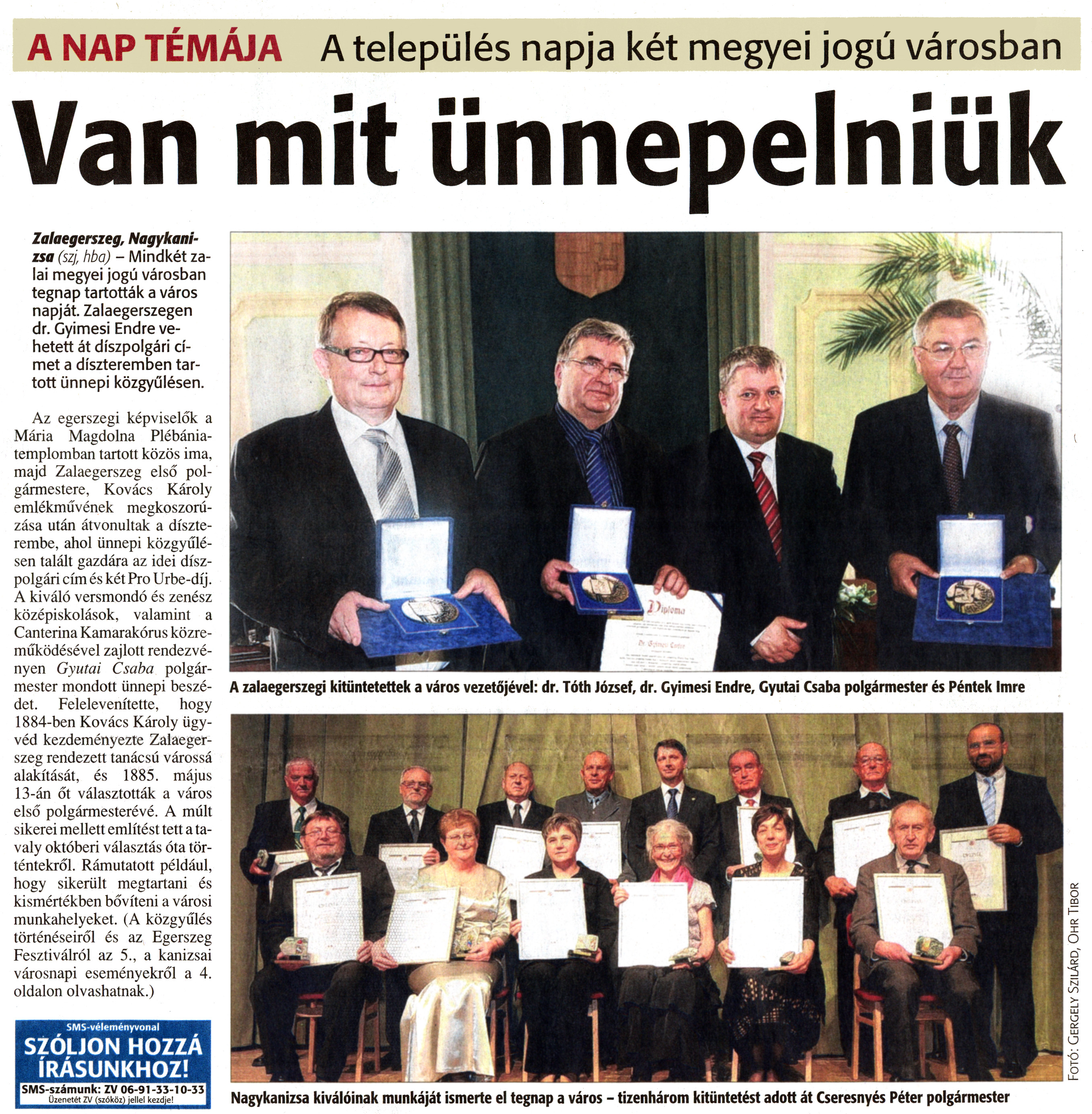 Nyilvános 1462 | 3684 | Zalai Hírlap 2011. május 14. 112. szám 1. oldal - Van mit ünnepelniük | A cikk szövege: A NAP TÉMÁJA A település napja két megyei jogú városban Van mit ünnepelniük Zalaegerszeg, Nagykanizsa (szj, hba) - Mindkét zalai megyei jogú városban tegnap tartották a város napját. Zalaegerszegen dr. Gyimesi Endre vehetett át díszpolgári címet a díszteremben tartott ünnepi közgyűlésen. Az egerszegi képviselők a Mária Magdolna Plébániatemplomban tartott közös ima, majd Zalaegerszeg első polgármestere, Kovács Károly emlékművének megkoszorúzása után átvonultak a díszterembe, ahol ünnepi közgyűlésen talált gazdára az idei díszpolgári cím és két Pro Urbe-díj. A kiváló versmondó és zenész középiskolások, valamint a Canterina Kamarakórus közreműködésével zajlott rendezvényen Gyutai Csaba polgármester mondott ünnepi beszédet. Felelevenítette, hogy 1884-ben Kovács Károly ügyvéd kezdeményezte Zalaegerszeg rendezett tanácsú várossá alakítását, és 1885. május 13-án őt választották a város első polgármesterévé. A múlt sikerei mellett említést tett a tavaly októberi választás óta történtekről. Rámutatott például, hogy sikerült megtartani és kismértékben bővíteni a városi munkahelyeket. (A közgyűlés történéseiről és az Egerszeg Fesztiválról az 5., a kanizsai városnapi eseményekről a 4. oldalon olvashatnak.) A zalaegerszegi kitüntetettek a város vezetőjével: dr. Tóth József, dr. Gyimesi Endre, Gyutai Csaba polgármester és Péntek Imre Nagykanizsa kiválóinak munkáját ismerte el tegnap a város - tizenhárom kitüntetést adott át Cseresnyés Péter polgármester |