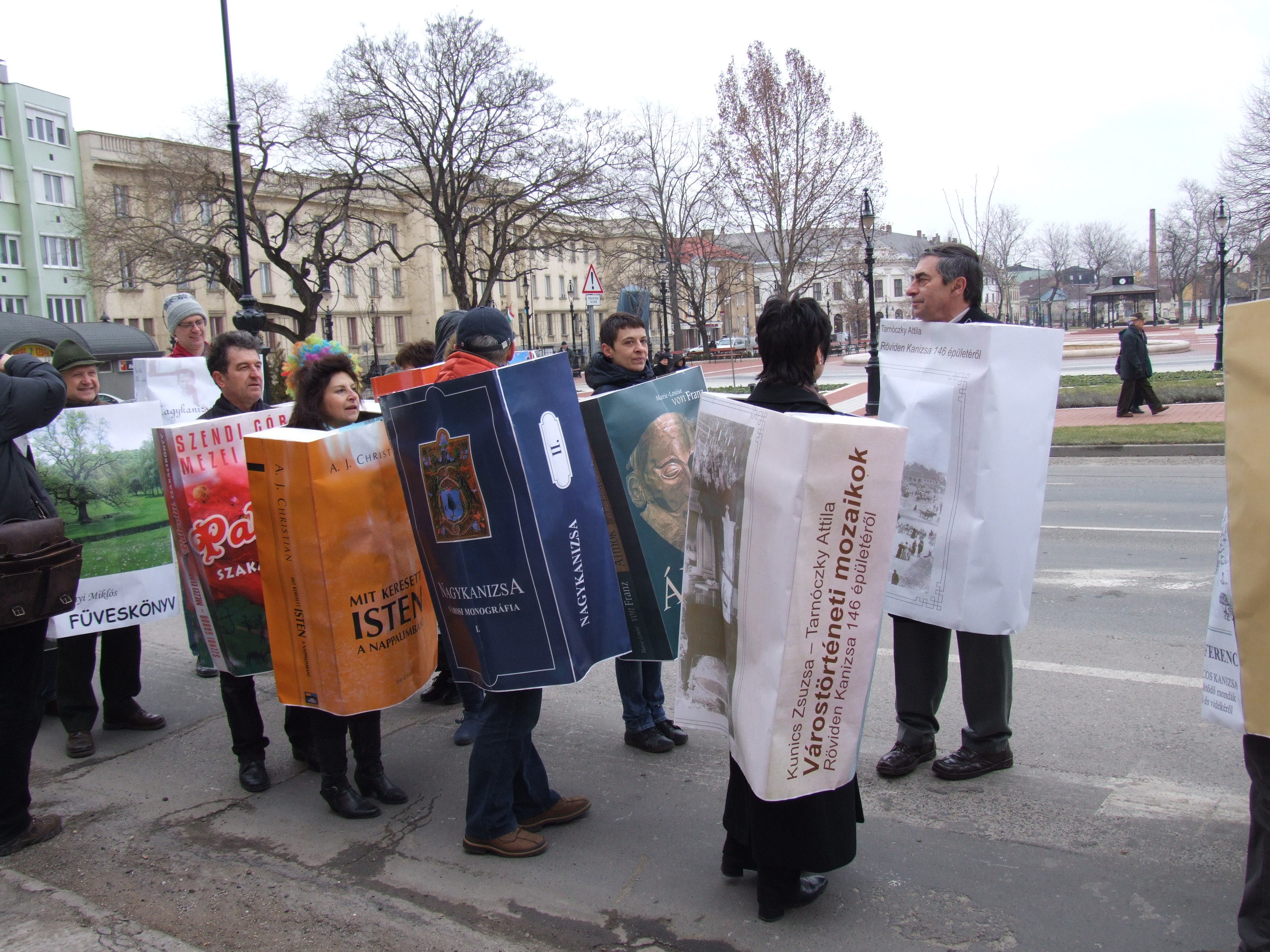 Nyilvános 980 | 1311 | 2013. február 9. A farsangi fánkfesztiválra készülve felhívásban kértük olvasóinkat, hogy öltsék magukra kedves könyvüket. Egy „könyvespolcnyi” jelentkező vette magára kedves olvasmányát, az ő vonulásukról készültek ezek a képek. A környezetükben néhol láthatók a Nagykanizsai Gólyalábasok, akik szintén a könyvtárhoz kötődnek. A „felvonuló kötetek” a könyvtár épületében még megtekinthetők. | |