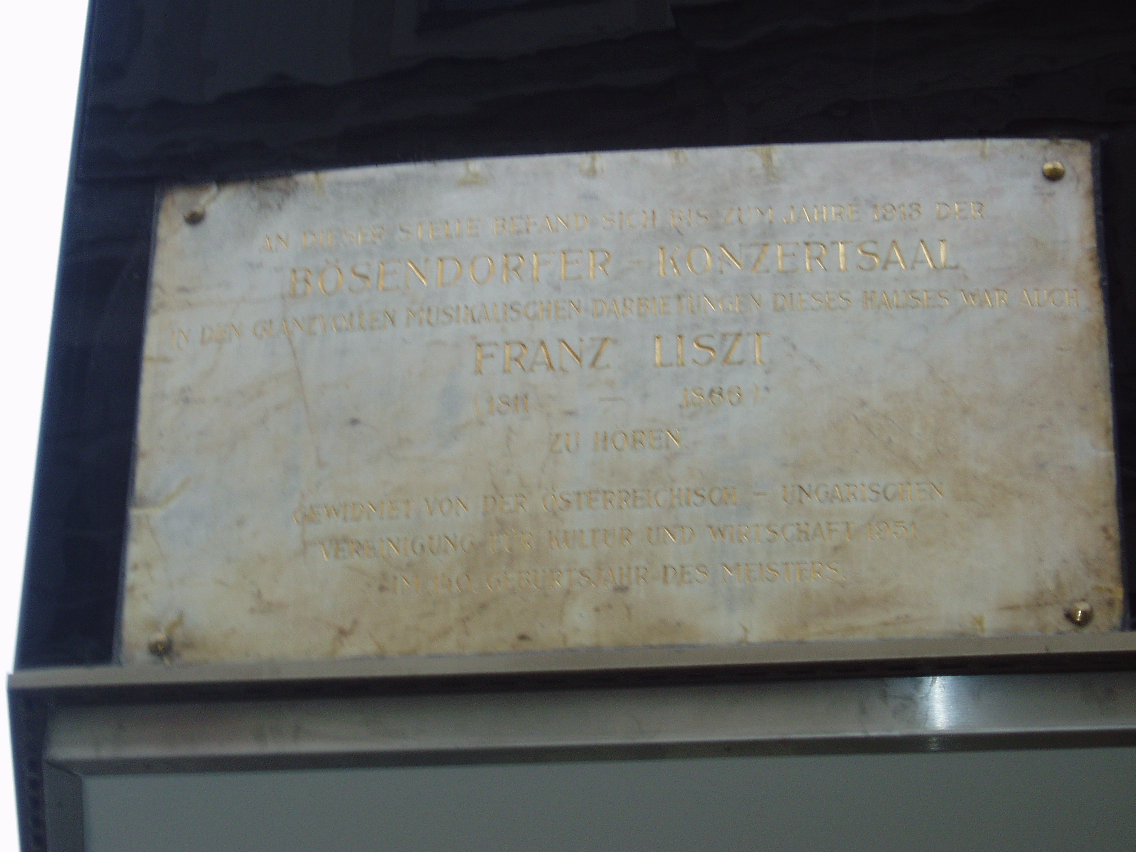 Nyilvános 1156 | 1955 | Herrengasse 8. Liszt Ferenc emléktáblája | A mai épület helyén egykor állott házban volt a Bösendorfer zongoragyár koncertterme. Számos jeles muzsikus lépett itt fel, köztük Liszt Ferenc, mint a homlokzaton elhelyezett emléktáblán is olvasható. |