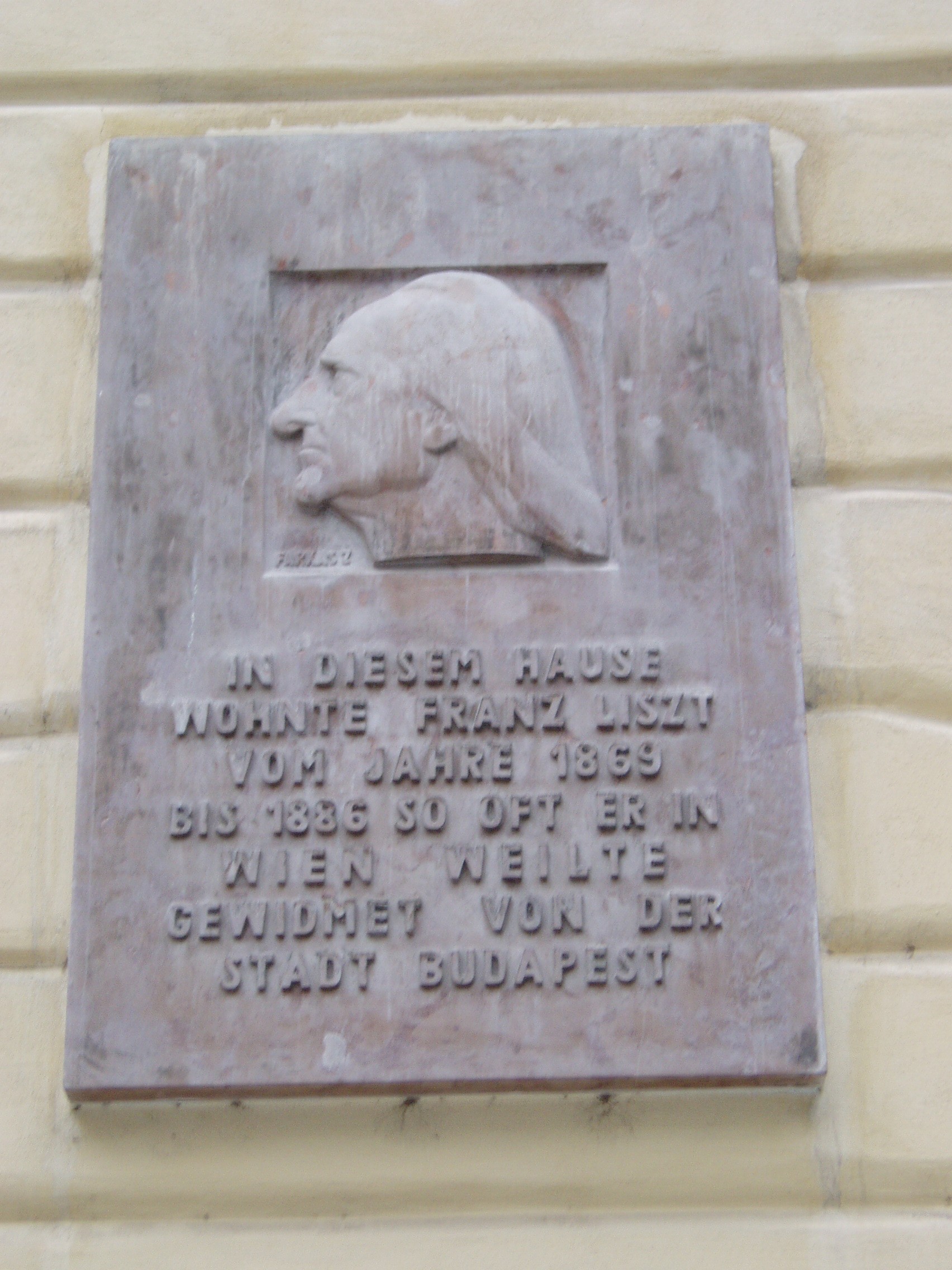 Nyilvános 1467 | 3268 | Freyung 6. Liszt-emléktábla | A Schottenhof épületegyüttesének a kert végében elhelyezett szárnyépülete homlokzatán a Farkas Zoltán alkotta dombormíves emléktáblán olvasható, hogy „e házban lakott Liszt Ferenc 1869-86 között, valahányszor Bécsben tartózkodott”. A táblát Budapest városa adományozta. |