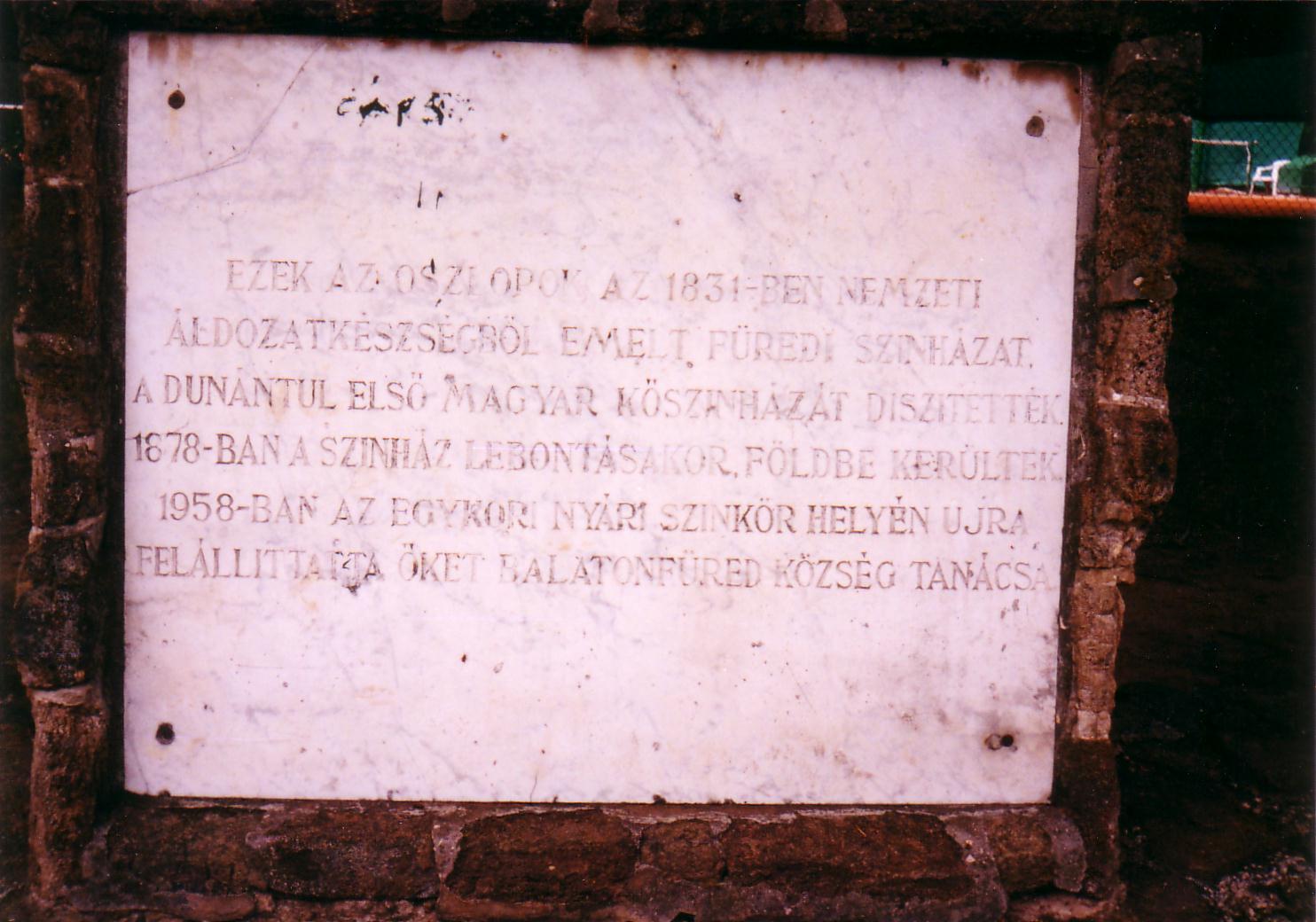 Nyilvános 1401 | 3915 | Balatonfüred, Kiserdő | A Fenyvespark néven is ismert terület Balatonfüred központjában, a Gyógy tér mögött terül el. Az 1800-as évek közepétől az első világháborúig egymást követően két nyári színkör is működött itt. Bár Fürednek 1831-től volt állandó kőszínháza, az épület azonban nagyon levegőtlen volt, ezért nyári játszóhelyet is létesítettek. A legtöbbet Latabár Endre és Molnár György társulatai szerepeltek itt. 1958 őszén a Kiserdő egy emelkedésén, a teniszpályák szélén kialakított félkör alakú helyen, az egykor itt állt két egymást követő nyári színkör közvetlen közelében állították fel a reformkorban létesített füredi kőszínház megmaradt, annakidején Festetics László által adományozott oszlopait. A hat oszlop tetejét pergolaszerűen képezték ki, s a harmadik és negyedik oszlop között emléktáblát helyeztek el. A fénykép 2000 júliusában készült. Felh. irod.: Lipták Gábor – Zákonyi Ferenc: Balatonfüred. Veszprém, 1956 Bándi László: Emlékhelyek Veszprém megyében. Veszprém, 1996 |