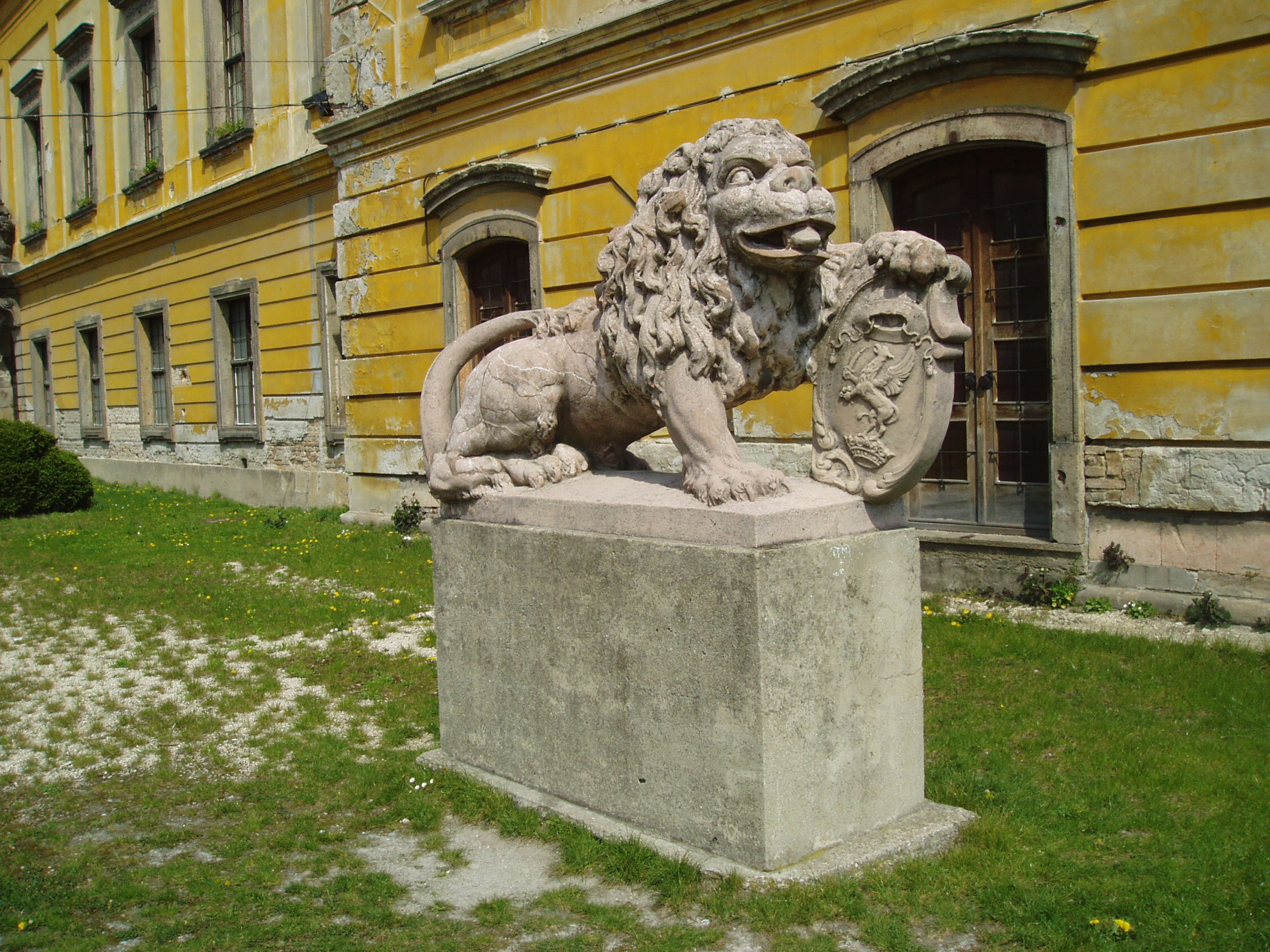 Nyilvános 1162 | 2157 | Pápa, Fő tér 1-3. Esterházy-kastély | A barokk kastély a korábban itt állott végvár helyére épült, részben annak alapfalai, kövei felhasználásával. A régi várat az 1740-es évektől Esterházy Ferenc (1683–1754) tárnokmester kezdte átalakítani Franz Anton Pilgram tervei alapján. A barokk várkastély kialakítása 1784-re fejeződött be Esterházy Ferenc fia, Eszterházy Károly egri püspök idejében Fellner Jakab, majd Grossmann József vezetésével. Az U alakú, egyemeletes épület a versailles-i palota nyomán elterjedt francia kastélytípus képviselője. A képen a díszudvar bejáratánál elhelyezett két kőoroszlán egyike látható, amely az Esterházyak címerpajzsát tartja. Az oroszlánok 1945-ig a kastélyt övező kerítés díszes kovácsoltvas kapuját őrizték. A fénykép 2007 áprilisában készült. Felh. irod.: Németh Adél - Szabó Lajos: Pápa. Bp. Panoráma, 1989 Pápa. Szerk. Sz. Farkas Aranka. Bp., Magyar Képek, 2000 |