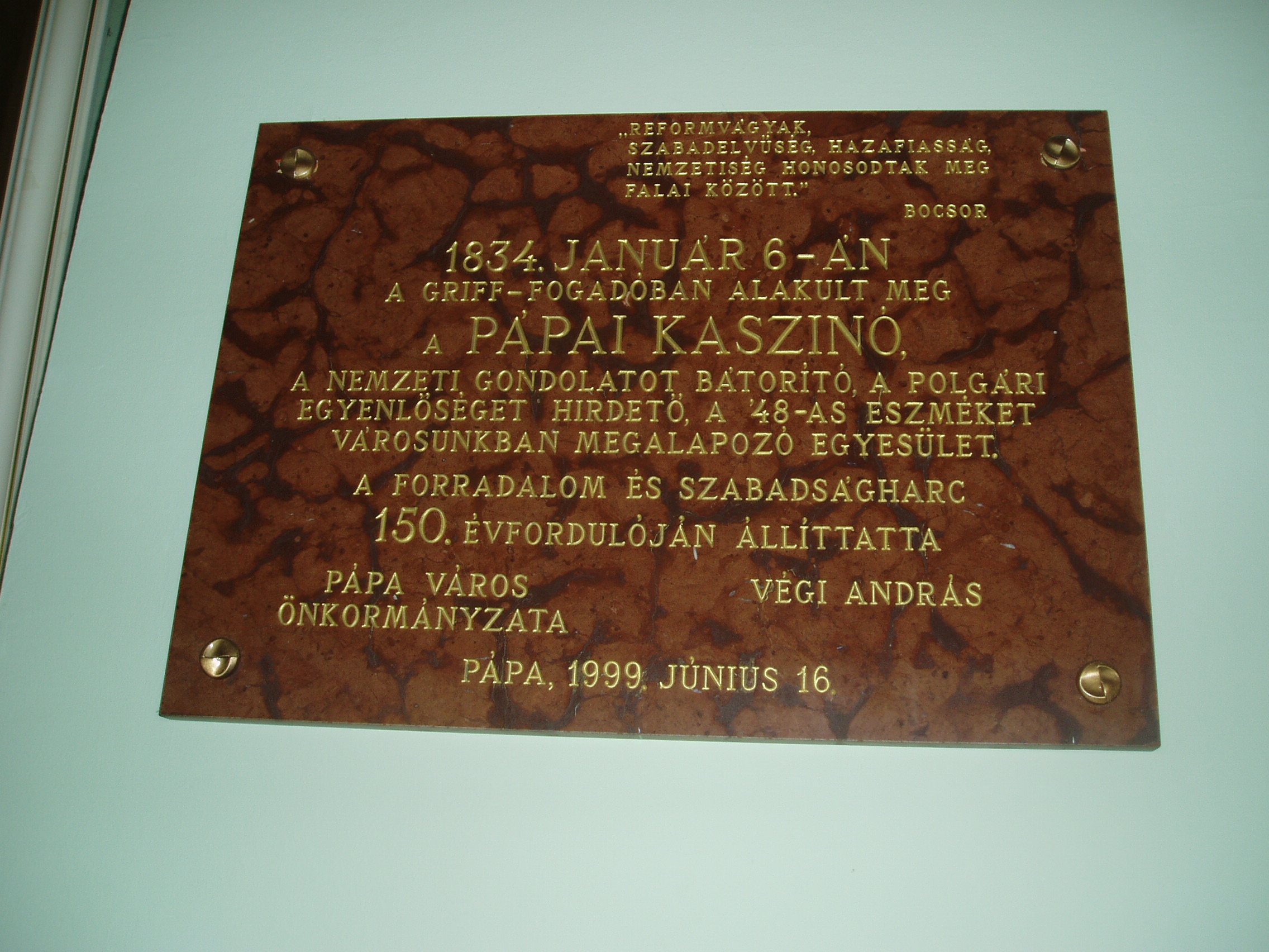 Nyilvános 1110 | 1728 | Pápa, Fő utca 15. Griff Szálló - a Kaszinó megalakulásának emléktáblája | A Fő tér és a Fő utca sarkán áll a Griff Szálló copf stílusú, 1780–1790 között emelt, 1870 körül némileg átalakított épületegyüttese. Nevét az Esterházy család címerállatáról kapta. A Fő utca felőli oldalt Kapuszínnek is nevezik, ugyanis az emelet alatti részen nyílik Pápa sétálóutcájának, a Kossuth utcának a bejárata. A ház másik része a szálloda. A XIX. század folyamán a Griff volt a pápai társas élet központja. Itt alakult meg 1834-ben, Széchenyi István kezdeményezése nyomán — az országban az elsők között — a pápai kaszinó. E jeles eseménynek 1999-ben felavatott vörös márványtábla állít emléket. A Griff ma is meglévő patinás tánctermében — az ún. Tükörteremben — egykor színielőadások és megyebálok zajlottak. Testőrtiszt korában táncolt itt leendő feleségével, Szegedy Rózával Kisfaludy Sándor. Jónéhány évtizeddel később Mikszáth Kálmán volt jelen egy itt tartott táncmulatságon, s ez az élmény inspirálta A Noszty fiú esete Tóth Marival című regényének báli jelenetét. A XIX. század legelejétől 1881-ig, a pápai kőszínház (lásd: Pápa, Március 15. tér) megépítéséig a városba érkező különböző színtársulatok — kevés kivétellel — a Griff nagytermében tartották előadásaikat. A magyar színjátszás nagy egyéniségei közül játszott itt Déryné és Kántorné is. 1842-ben a színielőadások rendszeres látogatója volt két pápai diák, akik maguk is színészi–művészi vágyakat melengettek szívükben: Petőfi Sándor és Jókai Mór (akkor még Petrovics Sándor és Jókay Móric). Petőfi már itt tapsolhatott későbbi jóbarátjának, Egressy Gábornak, aki nevezetes szerepeiben lépett fel a társulat vendégeként — többek között Hamletet és Lear királyt játszotta. A társulat vezető színésznője Szatmáryné Farkas Lujza volt, aki elbűvölte a kamasz Petőfit. Petőfi és Jókai tiszteletüket kívánták tenni a művésznőnél, akit azonban éppen egy társnőjével civakodva találtak a Griff folyosóján. Petőfi — kiábrándulva — ekkor írta meg Szín és való című költeményét, amellyel aztán két arany pályadíjat nyert. A teremben sok jeles hangversenyt is rendeztek. 1937-ben fellépett itt Bartók Béla is fiatal kamarapartnerével, Gertler Endre hegedűművésszel. E nevezetes koncert 60. évfordulóján, 1997-ben emlékhangversenyt rendeztek ugyanitt, melyen részt vett az akkor már 90 esztendős Gertler Endre is. Mindkét eseményről vörös márványtábla emlékezik meg a Tükörteremben. Felh. irod.: Pápa. Szerk. Sz. Farkas Aranka. Bp., Magyar Képek, 2000. Németh Adél – Szabó Lajos: Pápa. Bp. Panoráma, 1989 Nádasdy Lajos: A pápai kőszínház története 1817–1931. Veszprém, 1981, Veszprém megyei Tanács www.kincsestar.radio.hu/harangok "A kényes úrfi s a rongyos baka". Tanulmányok két halhatatlan pápai diákról. Pápa, Pápai Református Gyűjtemények, 2001 |