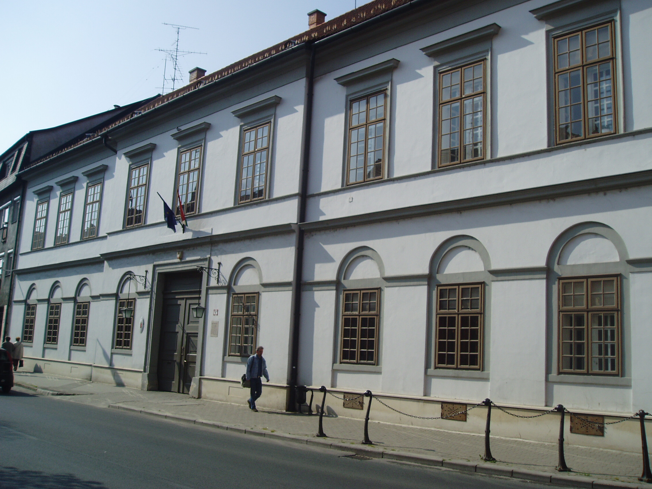 Nyilvános 1096 | 1925 | Pápa, Fő utca 17. Régi Megyeháza | A két utcára néző egyemeletes középületet 1824-ben építették klasszicista stílusban. 1732-ig Veszprém vármegyének nem volt hivatalos központja, s a megyegyűléseket elsősorban Pápán és Veszprémben tartották. 1732-ben Veszprémben felépítették a megyeházát a püspök által ajándékozott telken. Pápa azonban, ragaszkodván ősi jogaihoz, 1824-ben szintén épített egy megyeházát. Az épülethez jeles irodalmi emlék is fűződik: a pápai kollégium (lásd: Pápa, Petőfi u. 13.) önképzőköre 1842. június 30-án itt tartotta egyik ünnepi összejövetelét, amelyen részt vett Petőfi Sándor és Jókai Mór is. Petőfi - akkor még Petrovics Sándor az 1841/42-es tanévben a pápai református kollégium diákja volt. Szorosan vett iskolai tanulmányai mellett pályájára döntő hatással volt az iskola önképzőkörének - Képzőtársaságának - tevékenysége, amelyben az ugyancsak Pápán diákoskodó Jókaival, Orlai Petrich Somával és más jeles diákokkal vett részt. Az 1842. június 30-i ünnepségen az arra érdemesített diákok saját verseikkel, elbeszéléseikkel, szavalatokkal mutatkoztak be a város közönségének. Eszterházy Károly, Pápa ura pénzjutalmat is kitűzött a legjobb teljesítmények jutalmazására. Ez alkalommal Petőfi két verse is elhangzott diáktársai tolmácsolásában: Lehel című balladája, illetve a Szín és való (lásd még: Pápa, Fő tér 15.) című verse. Ő maga viszont más költőktől szavalt (akkoriban még színész szeretett volna lenni). Különösen nagy sikert aratott egy korabeli divatos verssel, Szalkay Máté: Ólmos botok című költeményével. Kölcsönkért jelmezben - lobogós ingben, pitykés nadrágban, kezében fütyköst forgatva - remekül eljátszotta a maradi korteseket parodizáló verset. Lehel című balladájával két arany pályadíjat nyert, s a jelen lévő Eszterházy grófnak annyira tetszett az Ólmos botok előadása, hogy jutalmát megtoldotta még egy arannyal. A műsoron Jókai is jelen volt, neki két elbeszéléséből olvastak fel diáktársai részleteket. A fénykép 2007 áprilisában készült. Felh. irod.: Németh Adél - Szabó Lajos: Pápa. Bp. Panoráma, 1989 "A kényes úrfi s a rongyos baka". Tanulmányok két halhatatlan pápai diákról. Pápa, Pápai Református Gyűjtemények, 2001 |