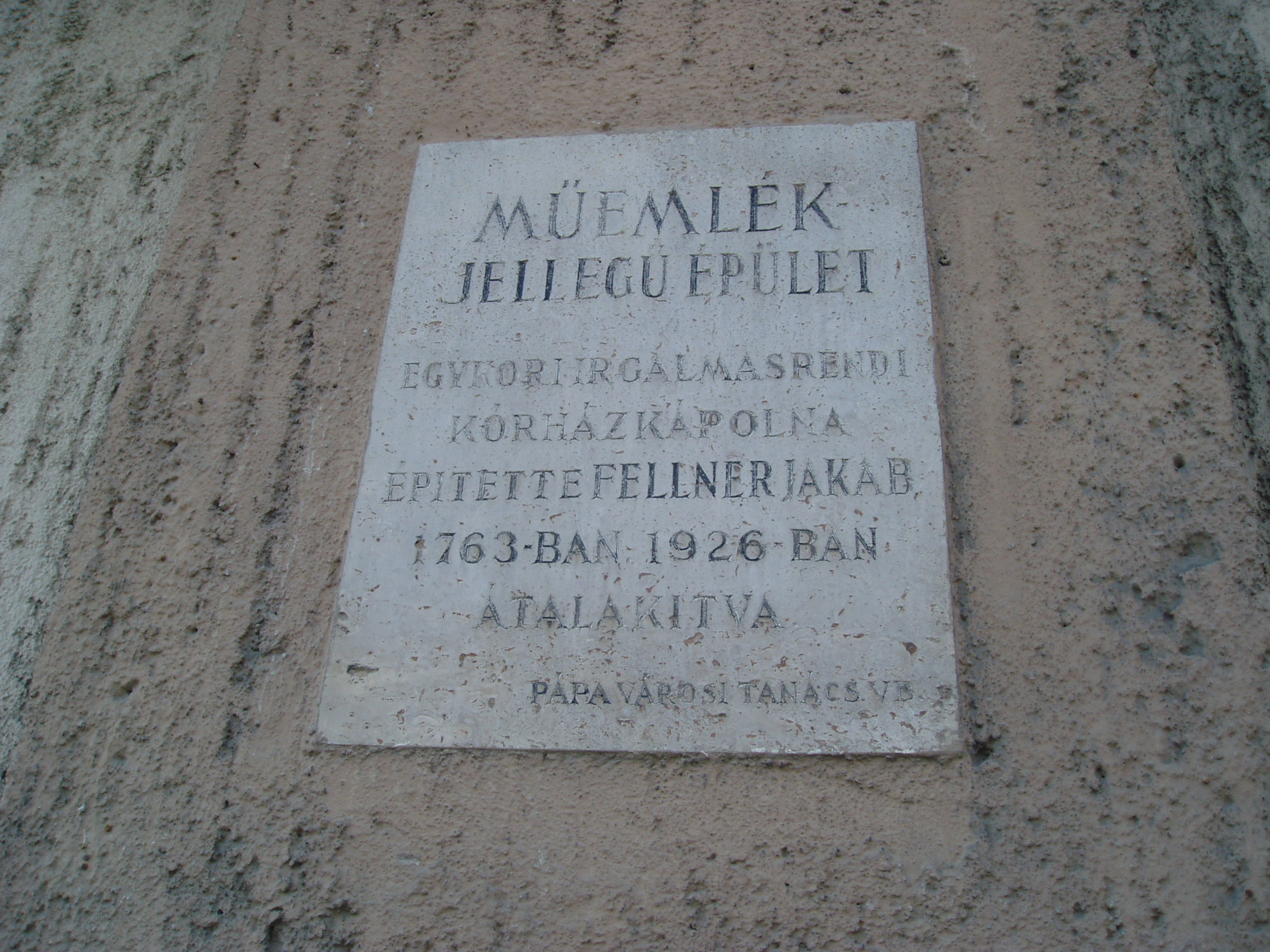 Nyilvános 1055 | 1655 | Pápa, Jókai utca 7. | A kórház régi épülete 1763-1768 között készült el Fellner Jakab tervei alapján. Az irgalmas rendet 1730 körül gróf Esterházy Ferenc telepítette le Pápán az akkor gyakori pestises betegek ápolására. Első kórházuk is ezen a helyen volt, melynek céljára a Zöldfa vendéglőt alakították át. A mai kórházat 1757-ben alapította Eszterházy Károly, Pápa ura, akkor váci, majd egri püspök (lásd még: Pápa, Jókai u. 9.). A Fellner Jakab által épített, azóta kibővített és átalakított épület egyemeletes, szárnyai négyszögű udvart vesznek körül. A ma is látható torony az egykori kórházkápolnához tartozott. A képen az erre vonatkozó műemléki tábla látható. A fénykép 2007 áprilisában készült. Felh. irod.: Németh Adél - Szabó Lajos: Pápa. Bp. Panoráma, 1989 |