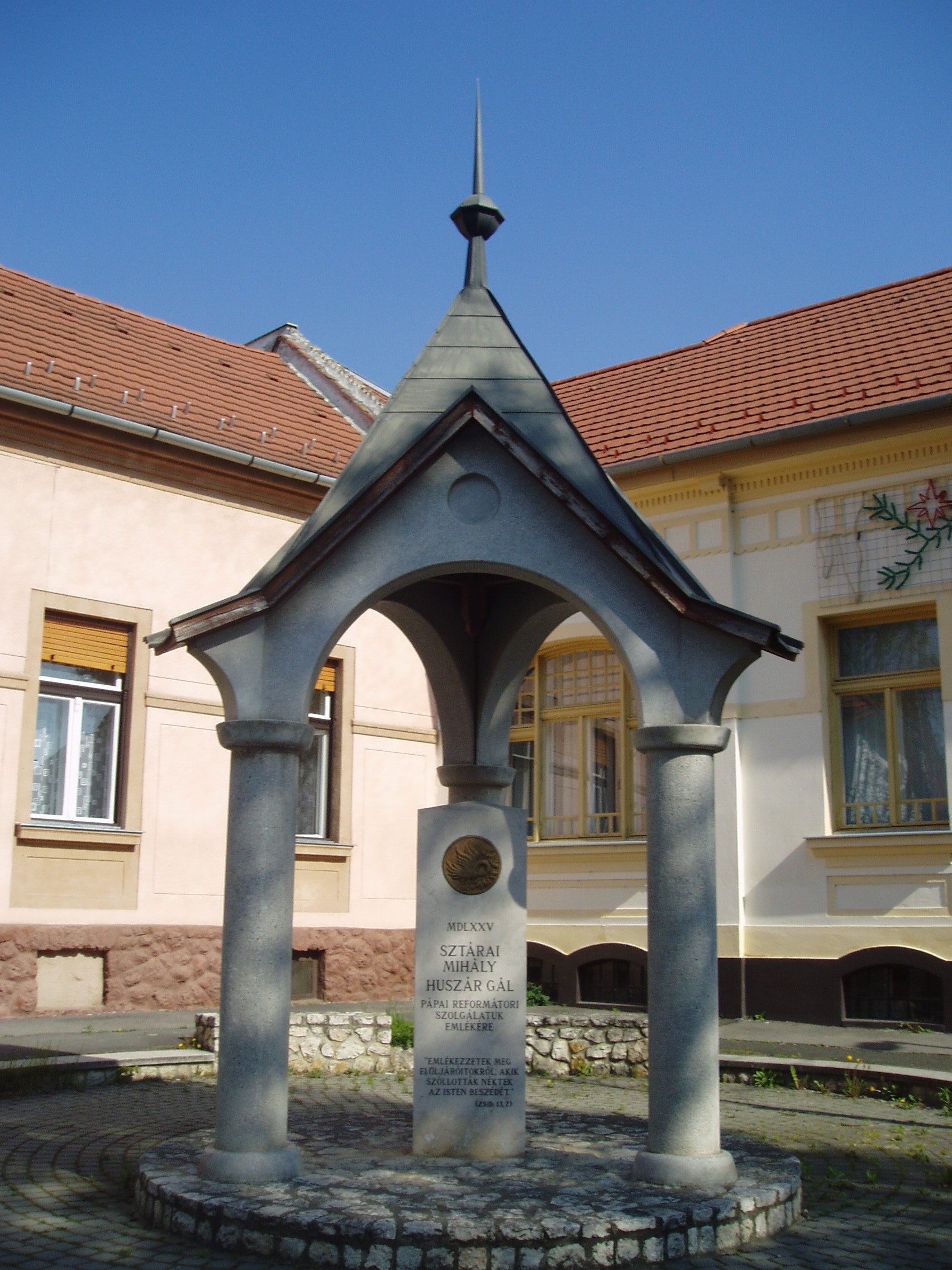 Nyilvános 1132 | 1938 | Pápa, Zimmermann utca 4. Sztárai Mihály és Huszár Gál emlékműve | Pápán szinte a reformáció kezdetétől hódítottak a protestánsok tanai. Így Sopron és Sárvár után ez a város lett a protestantizmus harmadik legjelentősebb dunántúli szellemi központja. Lelkész volt a városban Sztárai Mihály, valamint Huszár Gál és fia, Dávid. Sztárai Mihály (Drávasztára? – Pápa, 1575?), a nagy „éneklő reformátor” ferences szerzetesből lett a reformáció híve és egyik legeredményesebb terjesztője. Laskón (Tolna megye), majd Tolna városában, később Sárospatakon működött, onnét jött Pápára 1567 őszén. Hét–nyolc évet töltött itt lelkészként, utolsó éveiben Huszár Gállal együtt. Huszár Gál (1512 k. – Pápa, 1575. okt. 23.) eredetileg katolikus pap volt, de csatlakozott a reformációhoz, s a katolikus egyház kiátkozta. Egész nagyhatású munkásságát a reformáció szolgálatába állította. Zaklatott életet élt, mert az ellenreformáció többször elűzte helyéről: Magyaróvárott, Kassán, Debrecenben, Nagyszombaton, Komáromban, Rózsavölgyben, Komjátiban tevékenykedett. Élete utolsó évét töltötte Pápán, ahol 1575. október 23-án, 63 éves korában pestisben hunyt el. Halála napját állítólag korábban többször megjövendölte. Tevékenységét a városban fia, Huszár Dávid folytatta, aki 1577-ben itt nyomtatta ki a Heidelbergi Káté első magyar fordítását. Sztárai Mihály és Huszár Gál közös emlékművét a Zimmermann utca 4. számú épület előtt állították fel, közel az Anna térhez, amelynek azóta felszámolt temetőjében nyugodtak a hagyomány szerint Huszár Gál hamvai. A fénykép 2007 áprilisában készült. Felh. irod.: Németh Adél – Szabó Lajos: Pápa. Bp. Panoráma, 1989 Pápa. Szerk. Sz. Farkas Aranka. 2. kiad. Veszprém-Bp., Magyar Képek, 2000. http://church.lutheran.hu/reformatio/ppanteon/pp_ev_huszar_gal.htm Fabiny Tibor: Az evangélikusok Pápán. = w.mek.iif.hu/porta/szint/tarsad/tortenel/helytort/papa_1 |
