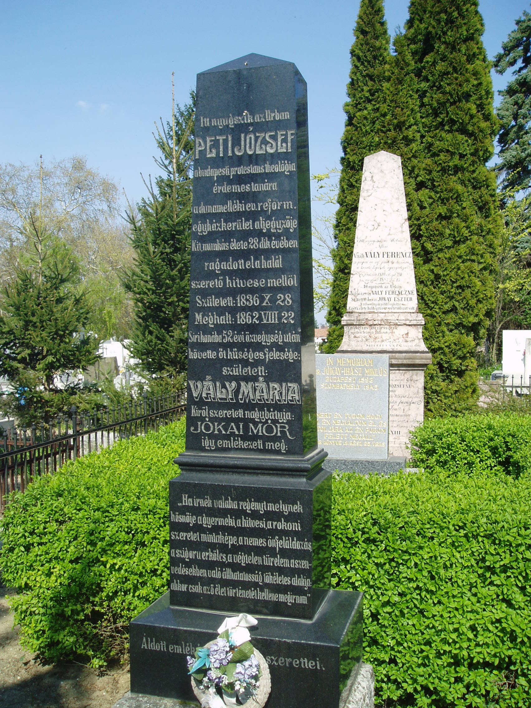 Nyilvános 1361 | 3659 | Rövid leírás | Teljes leírás (1.5 KB) | Pápa, Alsóvárosi temető: Vály Mari sírja A Jókai utcáról nyíló Temető utca vezet a XIX. század elején megnyílt Alsóvárosi köztemetőbe. A város sok neves személyiségének van itt a sírja. Itt nyugszik Vály Mari (Komárom, 1840. nov. 17. – Pápa, 1915. máj. 17.) emlékiratíró, Jókai Mór unokahúga (Eszter nővérének lánya, apja Vály Ferenc tanár). Férjének és gyermekének korai halála után Jókaiékhoz költözött, háztartásuk vezetésében segédkezett. Nagybátyja életét terjedelmes emlékiratban örökítette meg, amelyből szemelvényes kiadásban jelent meg: Emlékeim Jókai Mórról címmel csak részletek jelentek meg 1955-ben. Sírkövén nagybátyjának sorai olvashatók. Ugyanitt nyugszik férje, Peti József (Komlósd, 1831. okt. 24. – Pest, 1862. aug. 22.) tanár. Tanulmányait Csurgón kezdte, 1850-től Pápán, Bécsben és Bazelben folytatta, ahol teológiát is hallgatott. A pápai gimnáziumban 1856-ban, egy év múlva Kecskeméten, 1859-től Pesten a teológia tanára. A Duna-melléki Egyházkerület 1861-ben aljegyzővé választotta. Több tudományos értekezést írt, melyek a tiszántúli egyházi folyóiratokban és évkönyvekben jelentek meg. A fénykép 2007 áprilisában készült. Felh. irod.: Németh Adél - Szabó Lajos: Pápa. Bp. Panoráma, 1989 Veszprém megyei életrajzi lexikon. Veszprém, Veszprém Megyei Önkormányzat Közgyűlése, 1998 |
