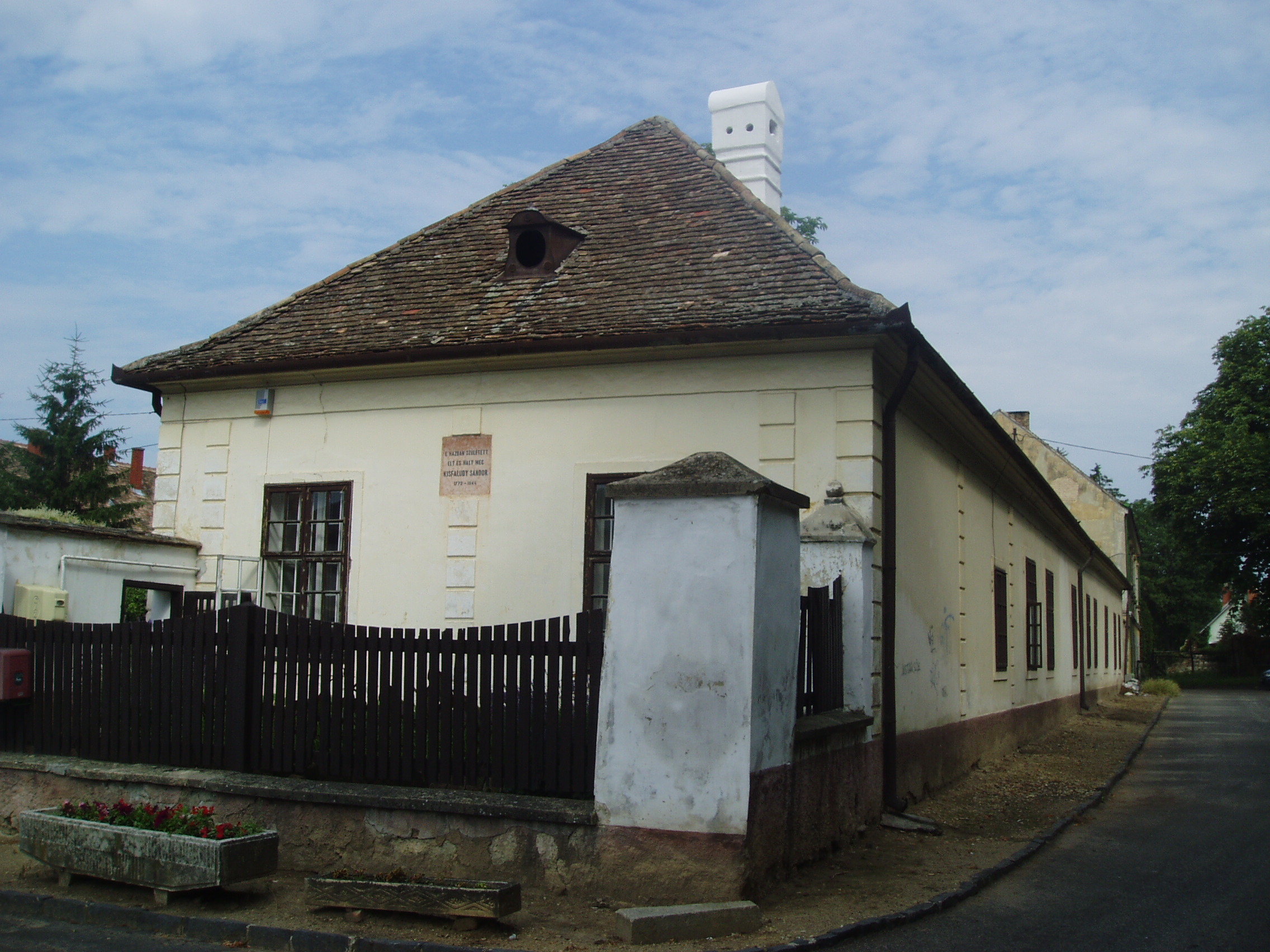 Nyilvános 1086 | 1796 | Sümeg, Kisfaludy tér 2. | Ebben a házban, amely ma a Városi Múzeum otthona, született és halt meg Kisfaludy Sándor. A XVII. században épült ház eredetileg a Sándorffy család tulajdona volt, a Kisfaludyakra örökség útján maradt. A XIX. században klasszicizáló stílusban többször is átépítették a boltíves barokk kúriát, ittlakása idején Kisfaludy Sándor is bővíttette. A költő 1772. szept. 27-én látta meg itt a napvilágot. Hat éves volt, amikor a család Tétre költözött (Károly öccse ott született 1788-ban). Eseménydús ifjúsága volt. 1793–1796 között a bécsi testőrség tagja. Részt vett a franciák elleni hadjáratban, fogságba is esett. 1799-ben leszerelt, a következő évben feleségül vette Szegedy Rózát. A házaspár Ötvös-pusztán, majd Kámban lakott. Sümegre 1805-ben pedig költöztek, itt éltek halálukig. Miután 1832-ben elveszítette szeretett feleségét, az idős költő újra megnősült, azonban második felesége, Vajda Amália is hamarosan meghalt. Ő maga itt, otthonában hunyt el 1844. október 28-án. Sírja a sümegi temetőben van (lásd: Sümeg, Temető). Kisfaludynak volt még egy ingatlana Sümegen, egy ma is álló présház (Sümeg, Külterület XI. 200). Sok időt töltött ott is, s ott vetette papírra az inszurrekció kudarcos történetét. A házat emléktábla jelöli, mellette áll Kisfaludy tölgyfája, amelyet a hagyomány szerint a költő ültetett (sajnos, fénykép nincs róla, nem találtam meg, amikor Sümegen jártam - K. K.) A fénykép 2007 júniusában készült. Felh. irod.: Koppány Tibor - Kozák Károly: Sümeg útikalauz. Veszprém, Idegenforgalmi Hivatal, 1965 Sümegi kalauz. Sümeg, Sümegi Fórum alapítvány, 1993 Kisfaludy Sándor. Veszprém, Veszprém Megyei Múzeumi Igazgatóság. /Pannon Panteon 1./ |