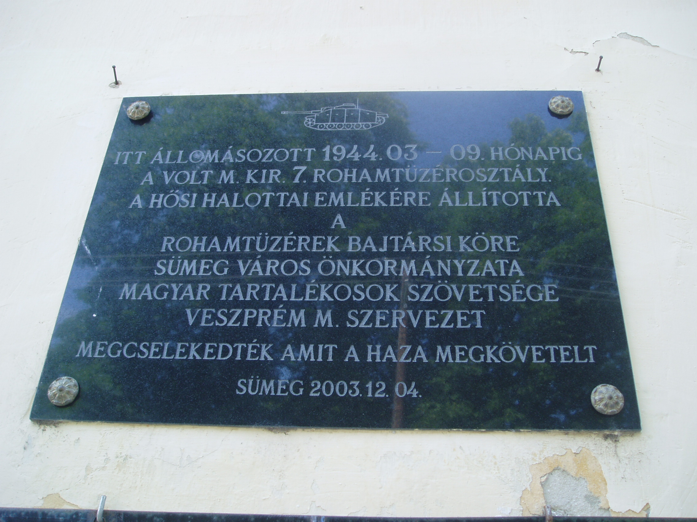 Nyilvános 1056 | 1563 | Sümeg, Ramassetter utca 10. | A Ramasetter utca házai jórészt a XVII. század második felében épültek, bár a legtöbbet később átalakították. A 10. számú épület is barokk stílusú, földszintes ház volt eredetileg, amelyre később emeletet építettek, s homlokzatát eklektikus stílusban átalakították. Az épület homlokzatán olvasható emléktábla szerint ebben a házban élt és halt meg Ramassetter Vince, "Sümeg atyja". Egy másik emléktábla történelmünk egyik legválságosabb időszakához kapcsolódik. Ebben az épületben állomásozott 1944 márciusa és szeptembere között a Magyar Királyi 7. Rohamtüzérosztály. A fénykép 2007 júniusában készült. Felh. irod.: Koppány Tibor - Kozák Károly: Sümeg útikalauz. Veszprém, Idegenforgalmi Hivatal, 1965 Veszprém megyei életrajzi lexikon. Veszprém, Veszprém Megyei Önkormányzat Közgyűlése, 1998 www.ekmk.hu/emlekhely/Emlekhelyek.html |