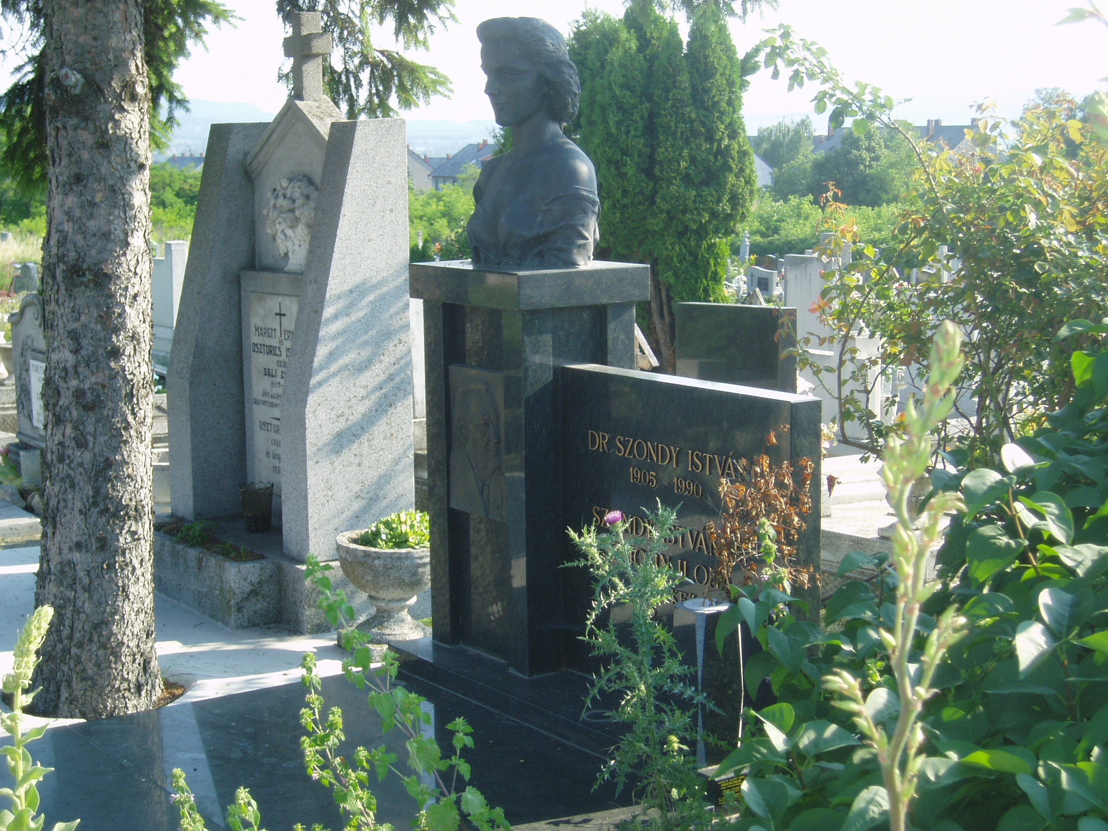 Nyilvános 1058 | 1890 | Sümeg, Temető. Szondy Istvánné "Lilike" sírja | Sümeg délkeleti határában, a Tapolcára vezető út mellett emelkedő lankás domboldalon találjuk a város köztemetőjét. Helyét még Bíró Márton püspök jelölte ki; jelentősebb számban a XIX. század eleje óta kezdtek ide temetkezni. A temetődomb tetején áll az 1816-ban épített, későbarokk stílusú temetőkápolna. Körülötte a sümegi élet utolsó két évszázada szinte valamennyi híres személyiségének sírja fellelhető. A Ferences rend sírkertjének nagy homokkő-keresztje közelében nyugszik Szondy István orvos és felesége, az 1987-ben elhunyt John Ilona, azaz Lilike. Lilike gazdag műgyűjteményt hozott létre, amelyet előbb saját házukban állítottak ki (lásd: Váralja u. 6.), majd az anyag a Kisfaludy Sándor Múzeumba került, ahol egy külön emlékszobában tekinthetők meg legértékesebb darabjai (lásd: Kisfaludy tér 2.). A fénykép 2007 júniusában készült. Felh. irod.: Koppány Tibor - Kozák Károly: Sümeg útikalauz. Veszprém, Idegenforgalmi Hivatal, 1965 Sümegi kalauz. Sümeg, Sümegi Fórum Alapítvány, 1993 Miklósi-Sikes Csaba: Kőbe vésett történelem. A sümegi városi temetők története és sírjelei 1950-ig. Sümeg, Sümegi Fórum Alapítvány, 2002 Veszprém megyei életrajzi lexikon. Veszprém, Veszprém Megyei Önkormányzat Közgyűlése, 1998 |
