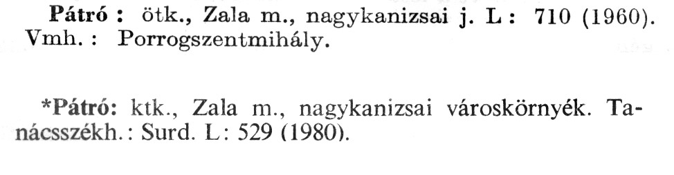 Nyilvános 1978 | 5984 | Rövid leírás | Teljes leírás (1 KB) | A szócikkek felismertetett szövege: (A csillag után az 1981-es kiadású kiegészítő kötetből származó szöveg következik) Pátró: ötk., Zala m., nagykanizsai j. L : 710 (1960). Vmh.: Porrogszentmihály. *Pátró: ktk., Zala m., nagykanizsai városkörnyék. Tanácsszékh.: Surd. L: 529 (1980). A szócikkek a következő lexikonból származnak: Cím: Új magyar lexikon Közreműködő: Berei Andor (1900-1979) (szerk.) Szerz. közl.: [szerk. Berei Andor et al.] Kiadás jelzés: 2. lny. Kiadás: Budapest : Akad. K., 1961-1962 Kötetei: 1., A - C 2., D - F 3., G - J 4., K - Me 5., Mf - R 6., S - Z 7. köt., A-Z Kiegészítő kötet (1972) Kiegészítő kötet, 1962÷1980 (1981) ETO jelzet: 03=945.11 Szakjelzet: 030 Cutter: U 28 Nyelv: magyar Megjegyzés: Bibliogr. a címszavak egy részének végén |