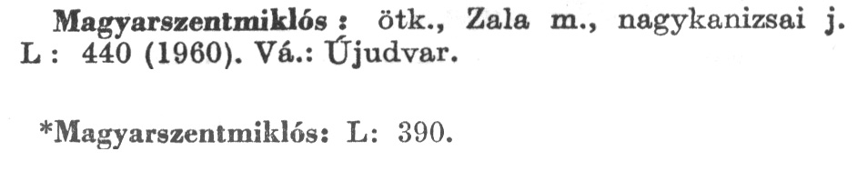 Nyilvános 2396 | 6377 | A szócikkek felismertetett szövege: | (A csillag után az 1972-es kiadású kiegészítő kötetből származó szöveg következik) Magyarszentmiklós: ötk., Zala m., nagykanizsai j. L : 440 (1960). Vá.: Újudvar. *Magyarszentmiklós: L: 390. A szócikkek a következő lexikonból származnak: Cím: Új magyar lexikon Közreműködő: Berei Andor (1900-1979) (szerk.) Szerz. közl.: [szerk. Berei Andor et al.] Kiadás jelzés: 2. lny. Kiadás: Budapest : Akad. K., 1961-1962 Kötetei: 1., A - C 2., D - F 3., G - J 4., K - Me 5., Mf - R 6., S - Z 7. köt., A-Z Kiegészítő kötet (1972) Kiegészítő kötet, 1962÷1980 (1981) ETO jelzet: 03=945.11 Szakjelzet: 030 Cutter: U 28 Nyelv: magyar Megjegyzés: Bibliogr. a címszavak egy részének végén |