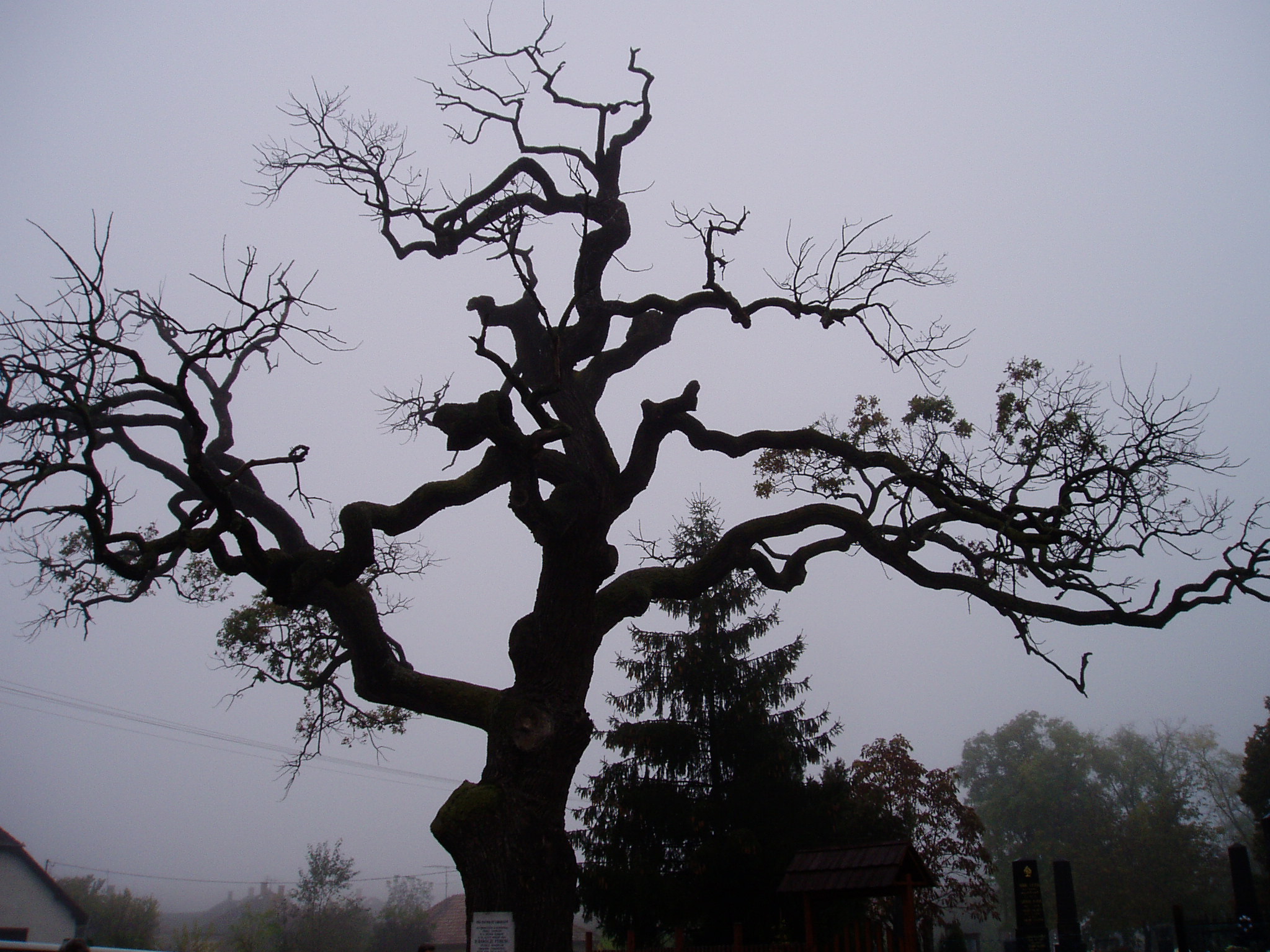 Nyilvános 1186 | 2180 | Ordas, Dózsa György út: Rákóczi-fa | A temető mellett látható az a hatalmas, védett tölgyfa, amely alatt - a hagyomány szerint - a vezérlő fejedelem, II. Rákóczi Ferenc is megpihent. A fa magassága 20 méter, 150 centiméteres a törzsátmérője, jól fejlett a lombkoronája, életkora meghaladja a 350 évet. A fénykép 2004 októberében készült. Felh. irod.: www.vendegvaro.hu |