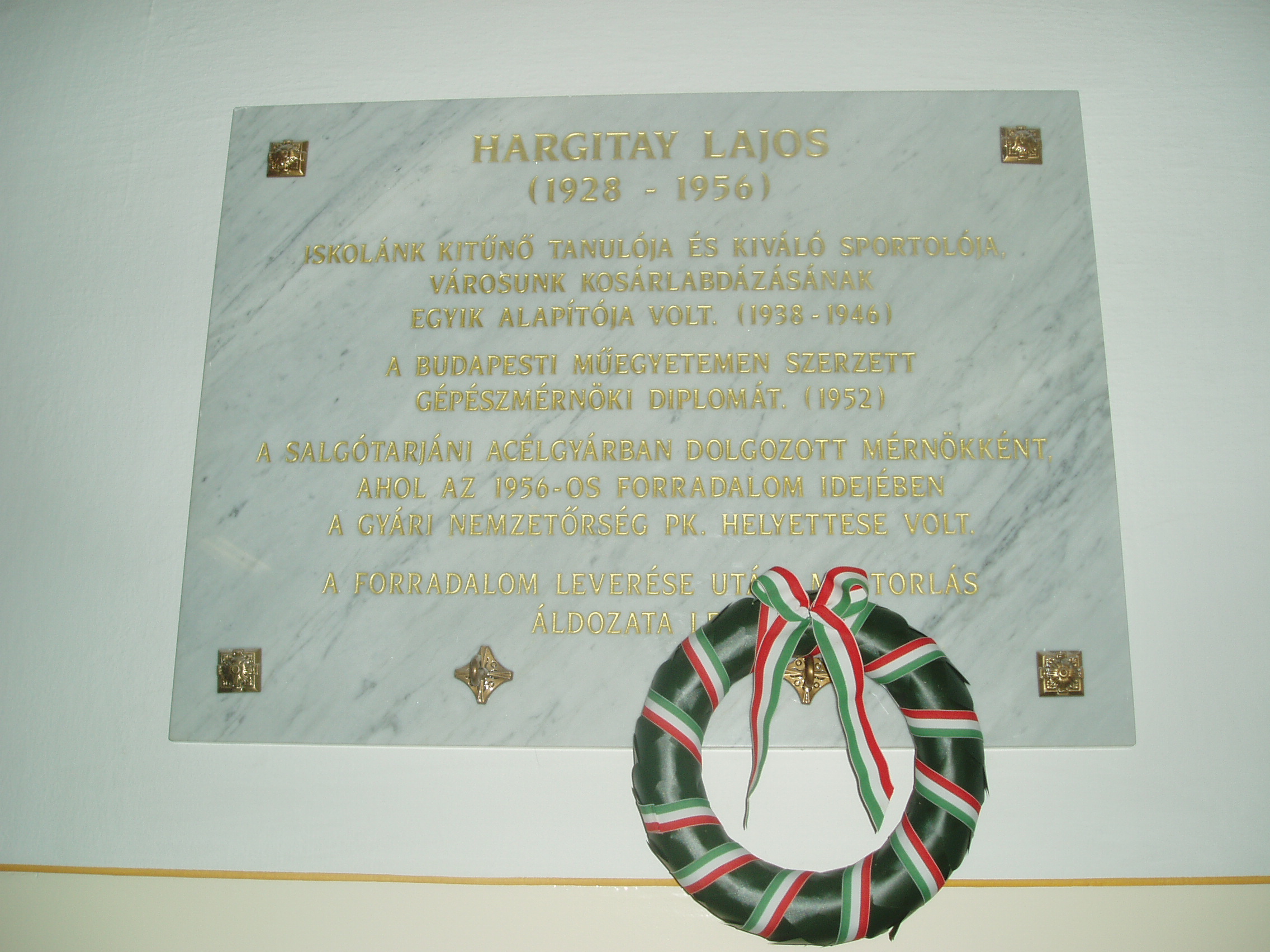 Nyilvános 1038 | 1613 | Baja, Szent Imre tér 5. III. Béla Gimnázium: Hargitay Lajos 1956-os mártír emléktáblája | Hargitay Lajos (1928-1956) jeles diák és kiváló sportoló volt, a város kosárlabdázásának egyik alapítója. 1952-ben szerzett diplomát a budapesti Műszaki Egyetemen, majd mérnökként a salgótarjáni acélgyárban dolgozott. Az 1956-os forradalom idején a gyári nemzetőrség parancsnokhelyettese volt. Bírósági eljárás nélkül lőtték agyon 1956. december 12-én Hadady Rudolf műszaki fordítóval együtt. Holttestüket az Ipolyban találták meg. Schiffer Pál "Engesztelő" címmel készített róluk dokumentumfilmet még 1989-ben. A fénykép 2007 októberében készült. Felh. irod.: Eörsi László: Dokumentumfilmek '56 (1988-2003). = www.rev.hu/html/hu/tanulmanyok/1956/dokfilm.html |