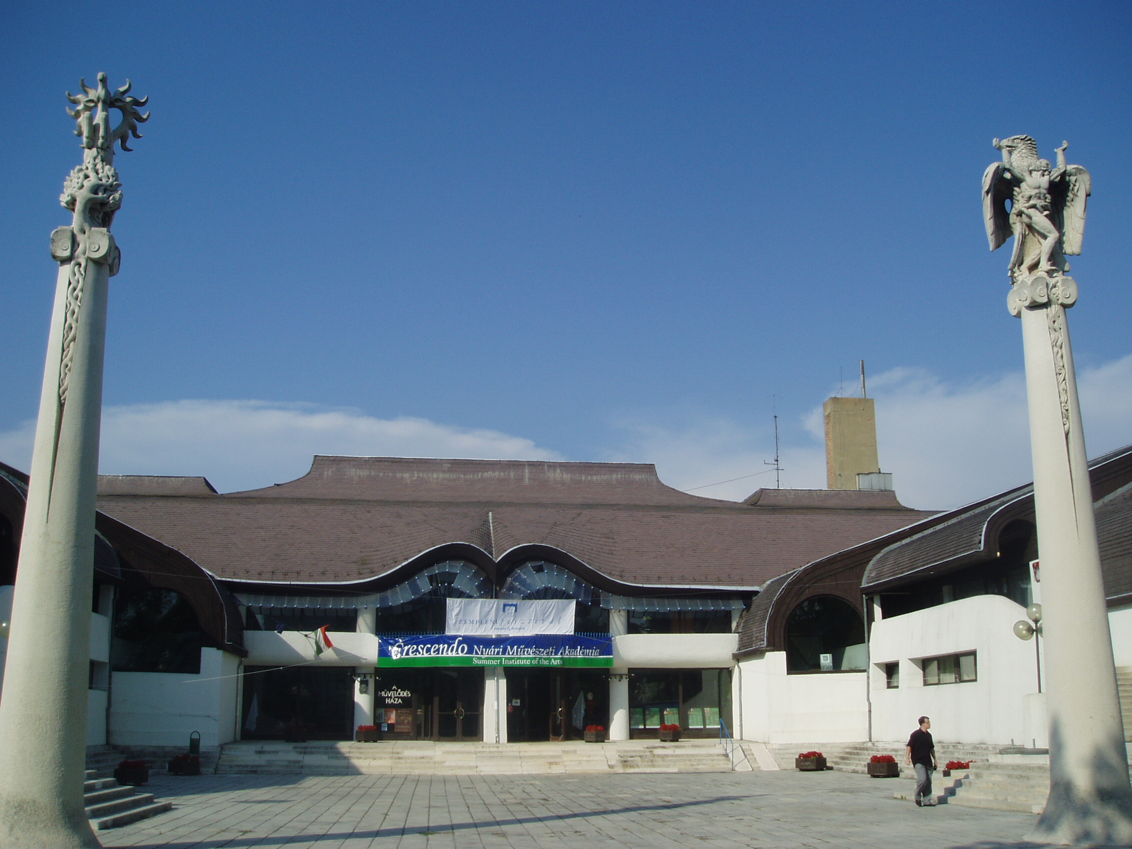 Nyilvános 1419 | 3092 | Rövid leírás | Teljes leírás (1.48 KB) | Sárospatak, Eötvös utca 21. A Művelődés Háza Sárospatak megújuló városképében nyomon követhető Makovecz Imre építész munkássága, aki több épületet tervezett a városban: a művelődési házon kívül az Árpád Vezér Gimnáziumot és a Hild tér lakóházait. A Művelődés Háza monumentális, látványos építészeti megoldásokban bővelkedő alkotás. A Kortárs magyar művészeti lexikon megállapítása szerint régészeti lelet formáját vette alapul: egy spirális, középen csappal-tengellyel ellátott díszcsat alakját. Az alaprajz szívében levő nagy színházterem a központ, innen futnak az erővonalak egészen a szélső, kisebb terekig. Megvalósítása az 1970-es évek végének politikai légkörében sok küzdelmébe került tervezőjének. Felépülése után az UIA Kairói Világkongresszusának zsűrije az 1983-as év tíz legfontosabb épületének egyikévé nyilvánította. Az épülethez szervesen kapcsolódik a főbejárat előtt álló oszlopokon a magyarság eredetére utaló két szobor, amelyek Péterffy László szobrászművész munkái. A fénykép 2007 augusztusában készült. Felh. irod.: Látnivalók Borsod-Abaúj-Zemplén megyében. Miskolc, Well-PRess, 1995 Kortárs magyar művészeti lexikon. Bp. Enciklopédia, 1999-2001 Magyarország a XX. században III. kötet. Szekszárd, Babits Kiadó, 1998 www.amuvelodeshaza.hu/bemutat.htm |
