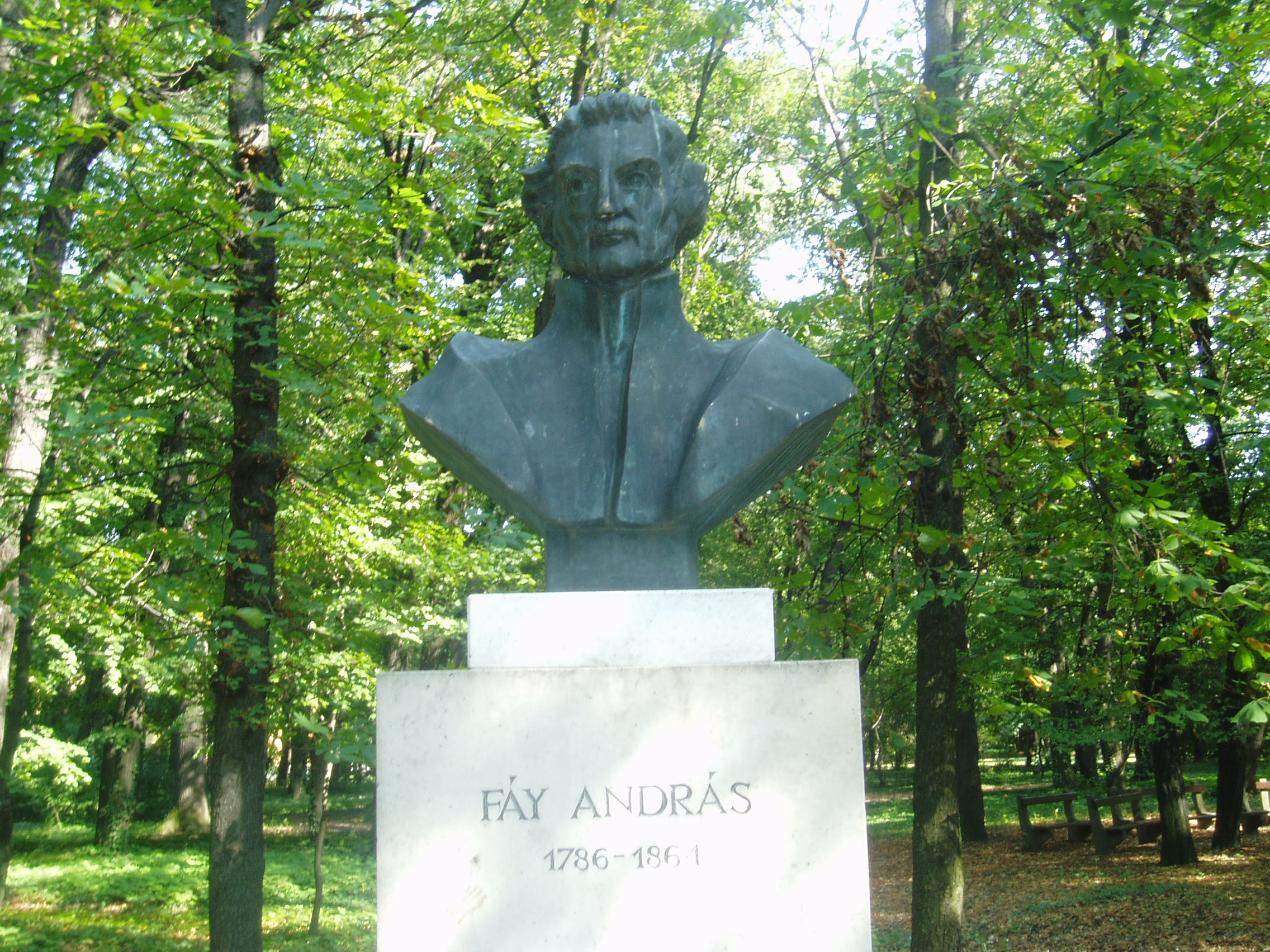 Nyilvános 1065 | 1824 | Sárospatak, Iskolakert: Fáy András szobra | A Református Kollégium (lásd: Sárospatak, Rákóczi u. 1.) bejáratával szemben találjuk az Iskolakertnek nevezett parkot. Az 1980-as években természetvédelmi területté nyilvánított Iskolakert sajátos nemzeti érték, mely egyedülálló az országban. Sétányai mentén Patakhoz kötődő jeles személyiségek szobrai állnak. Fáy András (1786-1864) bronzból készült mellszobra az Iskolakerti szoborsétányon található. Szathmáry Gyöngyi szobrászművész alkotását 1986-ban avatták fel. "A haza mindenese" 1893 és 1798 között tanult a kollégiumban (lásd: Sárospatak, Rákóczi u. 1.), majd a pozsonyi líceum után itt fejezte be középiskolai tanulmányait. A fénykép 2007 augusztusában készült. Felh. irod.: Látnivalók Borsod-Abaúj-Zemplén megyében. Miskolc, Well-PRess, 1995 www.sarospatak.hu/nevezetessegek Erős Zoltán: Magyar irodalmi helynevek A-tól Z-ig. Bp. Kis-Lant Kiadó, 1995 |