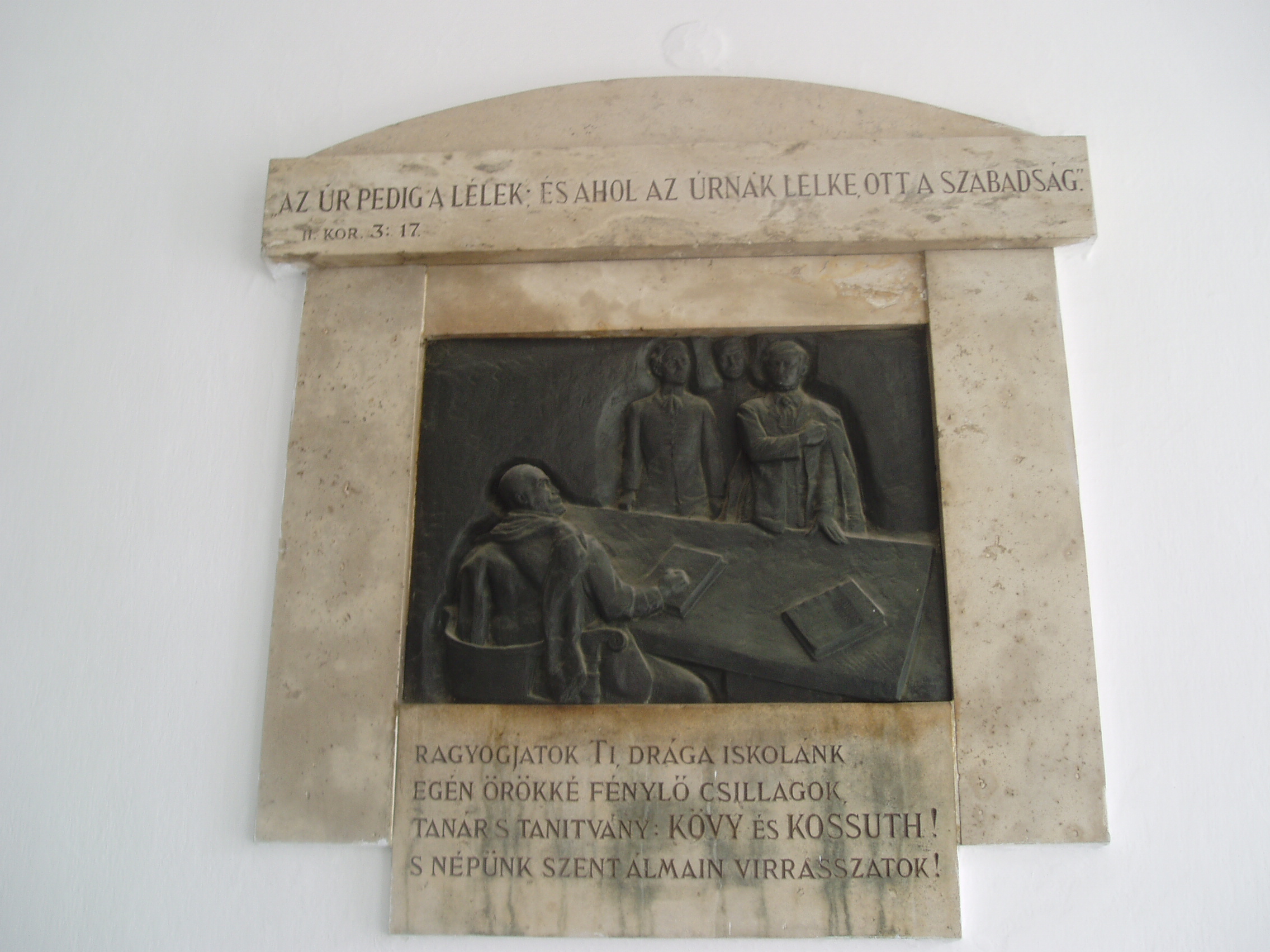 Nyilvános 1030 | 1581 | Sárospatak, Rákóczi utca 1. Református Kollégium | A kollégium főépülete, a Nagy Kollégium a Rákóczi út északi végén található, mely 1804–1814 között korai klasszicista stílusban épült. Szép ráccsal ellátott, háromíves nyílású kapuzat vezet be az un. „nagyportá”-ba, amelyet két sor vaskos pillér három hajóra oszt. Kétoldalt a falakon az iskolatörténet néhány fontosabb eseményének, illetve a kollégium nagy alakjainak bronz domborművű ábrázolásait helyezték el. A képen Kövy Sándor és Kossuth Lajos domborműve látható. Alkotója Szabados Béla szobrászművész. Állítatta 1940-ben a Pataki Diákok Országos Szövetsége. Kövy Sándor (1763-1829) a sárospataki református jogakadémián a magyar jog első professzoraként többek között Kossuth Lajos tanára volt. A dombormű a jeles tanárnak és nagy tanítványának állít emléket. Sokat idézett anekdota, hogy egy afférjuk után Kövy azt mondta a fiatal Kossuthnak - amit később maga a nagy államférfi örökített meg visszaemlékezéseiben: "a dominus Kossuthból országháborító lesz!" Kövyt kiváló jogtudósként is számon tartották. Számos latin és magyar nyelvű jogtudományi munkája jelent meg, közülük a latin nyelvű "Elementa" fél évszázadon keresztül az egyik legelterjedtebb jogi tankönyvként szerepelt. "A' magyar törvénynek rövid summája a' gyermekek számára" című könyvét 1848-ig a sárospataki gimnázium alsóbb osztályaiban tankönyvként használták. Ez az 1798 óta számos kiadást megért, 1989-ben hasonmás kiadásban is megjelentetett munkája a feudális magyar polgári jog közérthető összefoglalása. Alakját Mikszáth Kálmán is megörökítette "Különös házasság" című regényében. (Lásd még: Sárospatak, Kossuth u. 25.). A fénykép 2007 augusztusában készült. Felh. irod.: Détsy Mihály: Sárospatak. Bp. Corvina, 1974 Látnivalók Borsod-Abaúj-Zemplén megyében. Miskolc, Well-PRess, 1995 www.sarospatak.hu/nevezetessegek Lukács László: Anekdoták Kossuthról és Kövyről. = www.kodolanyi.hu/szabadpart/14/14_muv_lukacs.html |