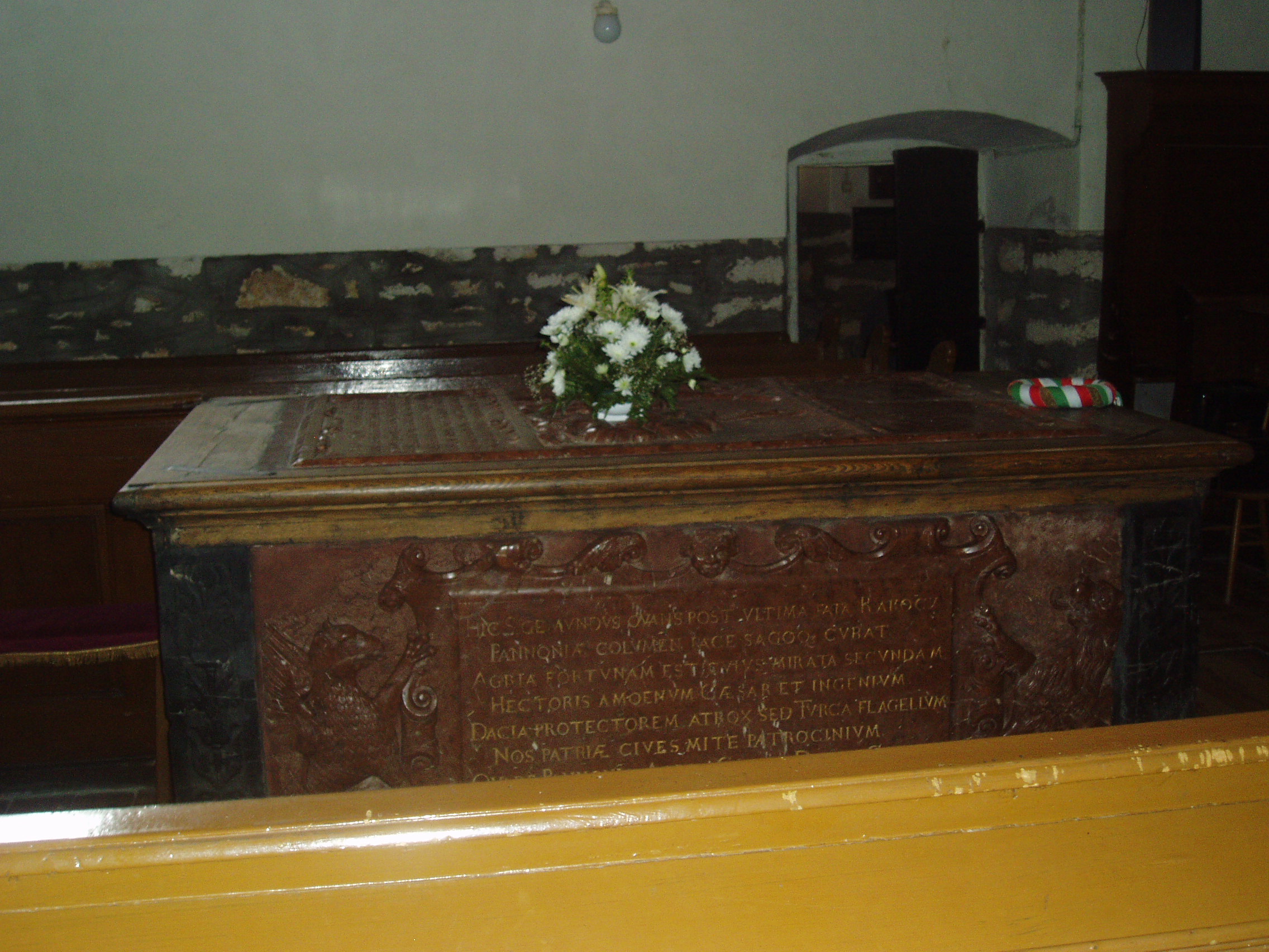 Nyilvános 1010 | 1722 | Szerencs, Kossuth tér 4. Református templom - Rákóczi Zsigmond tumbája | Szerencs legrégibb temploma a XIII. században épült eredetileg román stílusban. Az épületet 1480-ban átalakították, ekkor készült a középen álló gótikus torony. Az épületet gótikus támpillérek fogják körül. A templomot 1595-ben adományozta Rákóczi Zsigmond református hittársainak, az ő támogatásával jelentős átalakításokat is végeztek rajta. A templom nemcsak építészetileg nevezetes, hanem jelentős történelmi emlékhely is. 1605-ben az e falak között tartott országgyűlésen választották Bocskai Istvánt Magyarország fejedelmévé. A templom hajójában található Rákóczi Zsigmond (1544-1608) címerrel ékesített vörös márány szarkofágja (tumbája), amelyet 1618-ban a fejedelem három fia, György (1630-tól erdélyi fejedelem), Zsigmond és Pál készíttetett. A síremlék tetején levő latin szöveg fordítása: "Tekintetes és nagyságos felsővadászi Rákóczi Zsigmond, Borsod vármegye főispánja, a magyar király néhai lefőbb tanácsosa, először Szendrő, azután pedig Eger kapitánya és Erdély fejedelme, a magyarországi részek ura és a székelyek ispánja számára állíttatott jeles címer, akinek erénye gyakrabban híresedett el Magyarországon legnagyobb örvendezések közepette. Aki meghalt az ő kegyeletes szülőhelyén, Felsővadászon az 1608. évi december hó 5-én, midőn innen-onnan 64 évig élt. Három gyászoló fia: Rákóczi György , Zsigmond és Pál az ő legkedvesebb édesatyjuknak, aki irántuk és a haza iránt jól érdemesült." A szarkofág nyugati oldalán a következő felirat olvasható: "Tebenned reméltem Uram, hogy nem leszek porrá mindörökké! " A déli oldalon Miskolczi Csulyak István prédikátor verse őrzi Rákóczi Zsigmond emlékét: "Itt nyugszik végső lehelete után a békében és háborúban győzedelmes Rákóczi zsigmond, Magyarország oszlopa, akinek Eger csodálta szerencséjét, a császár fővezérének kies lángelméjét is, Erdély oltalmazóját, a kegyetlen török pedig ostorát, mi honfiak az ő kegyes atyai indulatát. Azért Magyarország, Eger, császár, honfiak, érdemihez illően fizessetek könnyeitekkel a haza atyjának." A síremlék alatt egy deszkaajtó felnyitása után lehet lejutni a kriptába. Ott található a fejedelem földi maradványait őrző urna, amelyet 1849-ben kapott adományul a város a X. zászlóalj tisztikarától. Bár 1644-ben, amikor Esterházy Miklós nádorispán csapatai megrohanták és kifosztották Szerencset, meggyalázták a fejedelem síremlékét is, Rákóczi Zsigmond koponyája megmaradt, s ma a kriptában egy kőurnában őrzik. Bizonyítéknak a koponyán található gyógyult fejsérüléseket tekintik, amelyeket az itt eltemetett személyek közül egyedül a fejedelem kaphatott. 1855. október 19-én járt a templomban, zempléni kirándulásuk alatt Arany János és Tompa Mihály. Arany a következőket írta levélben egy barátjának: "Szerencsen egy Rákóczi korabeli templomban láttuk Rákóczi Zsigmond fejedelem czímeres és feliratos márványravatalát.” A fénykép 2007 augusztusában készült. Felh. irod.: Tájékoztató feliratok a templomban www.szerencs.hu http://tokaj-turizmus.wplanet.hu/irodalmiut |
