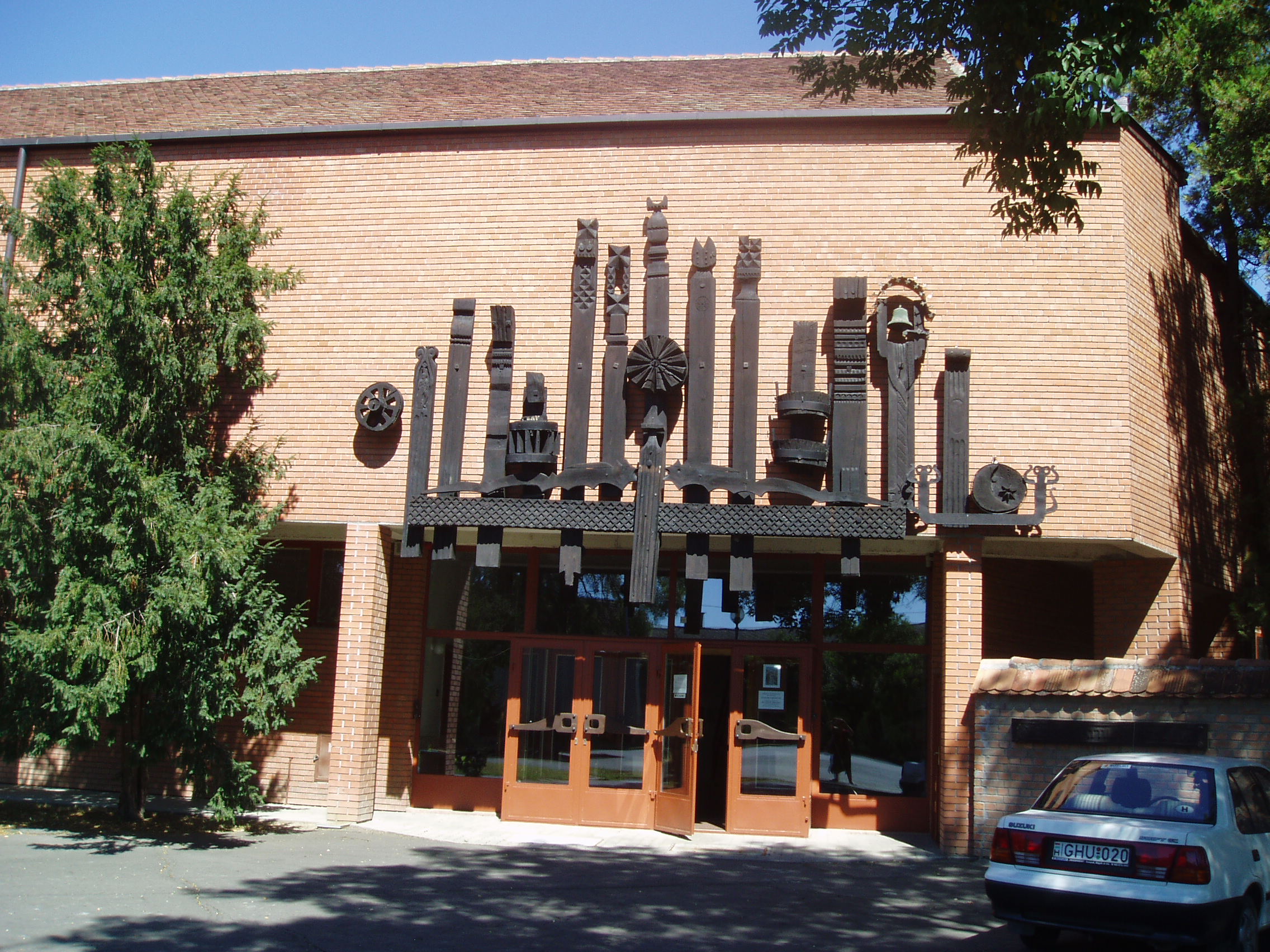 Nyilvános 1013 | 1400 | Makó, Megyeház utca 4. József Attila Múzeum | A múzeum, melynek eredete 1885-re vezethető vissza, de hivatalosan csak 1950-ben jött létre, 1981-ben költözött be a Vincze Mihály által tervezett mai épületbe. A homlokzatot Varga Imre 1981-ben készített fakompozíciója díszíti. Állandó kiállítása a város hétszáz éves fejlődését mutatja be. Látványos eleme az az első világháború előtti piacot ábrázoló életkép, mely ízelítőt ad Makó gazdag népéletéből. A fénykép 2007 júliusában készült. Felh. irod.: Barangolások Csongrád megyében. Miskolc, Well-PRess, 1997 www.mfm.u-szeged.hu/index.php?id=muzeumaink-mako |