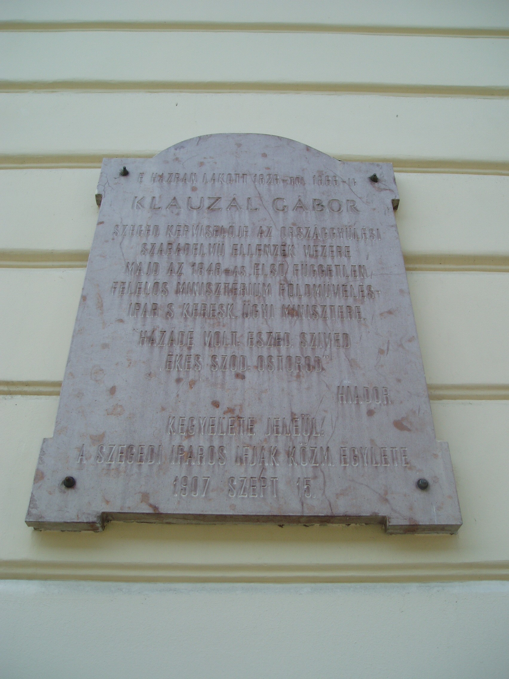 Nyilvános 942 | 1406 | Szeged, Klauzál tér 8. | Az eklektikus stílusú palota Lengyel Lőrinc bútorgyáros számára épült 1883-ban Ferdinand Fellner és Hermann Helmer tervei szerint. Az ennek helyén állott egykori házban lakott 1824-től haláláig Klauzál Gábor (1804-1866), az első népképviseleti kormány ipar-, kereskedelem- és földművelésügyi minisztere. Klauzál Gábor Pesten végzett jogot, s a hagyomány szerint amikor Imre bátyja hívására állást keresni jött Szegedre, egy kendőbe kötve, botja végén hozta minden vagyonát. Egy bálon hódította meg a szép Prezetska Máriát, egy jómódú gyógyszerész lányát. Bátyja és apósa vitte keresztül, hogy a jó képességű fiatal ügyvédet Csongrád megye 1828-ban első aljegyzőnek és fizetéses táblabírónak nevezte ki. Szeged 1832-ben követévé választotta. 1847-ben meghalt a felesége, így apósa házát ő örökölte. A szabadságharc bukása után kistétényi birtokán gazdálkodott. Az 1861. és 1865. évi országgyűlésen Szeged képviselője volt a Deák-párt programjával. Szegeden hunyt el, sírja a Belvárosi temetőben van (lásd: Szeged, Fonógyári út). Klauzál Gábor emléktábláját a jelenlegi épület Kelemen László utcára néző oldalán helyezték el. A fénykép 2007 júliusában készült. Felh. irod.: Péter László: Szeged. Bp. Panoráma, 1981 |