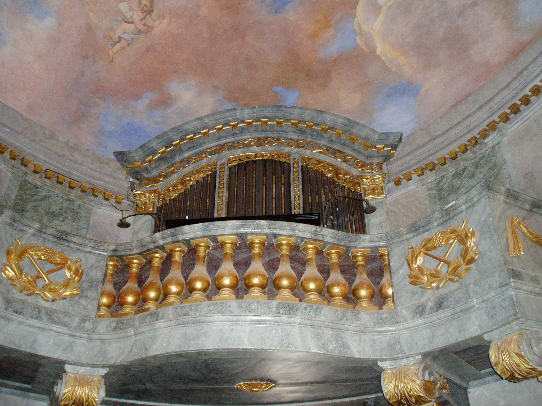 Nyilvános 1148 | 3004 | Nagycenk, Mauzóleum: orgonakarzat | A Széchényi család nyughelyét a temető létesítésével egyidőben Széchényi Ferenc építtette 1778-ban. A barokk stílusú sírkápolnát 1806-10 között klasszicista előtérrel bővítették. A téglalap alakú előcsarnok kazettás mennyezetét ion oszlopok tartják. Az ovális alaprajzú kápolnát kupola fedi, több kutató véleménye szerint Dorffmeister István freskóival. Innen jutunk a kriptába, a család számos jeles tagjának végső nyughelyére. A fénykép 2005 júliusában készült. Felh. irod.: Látnivalók Győr-Moson-Sopron megyében. Miskolc, Well-PRess, 2000 |