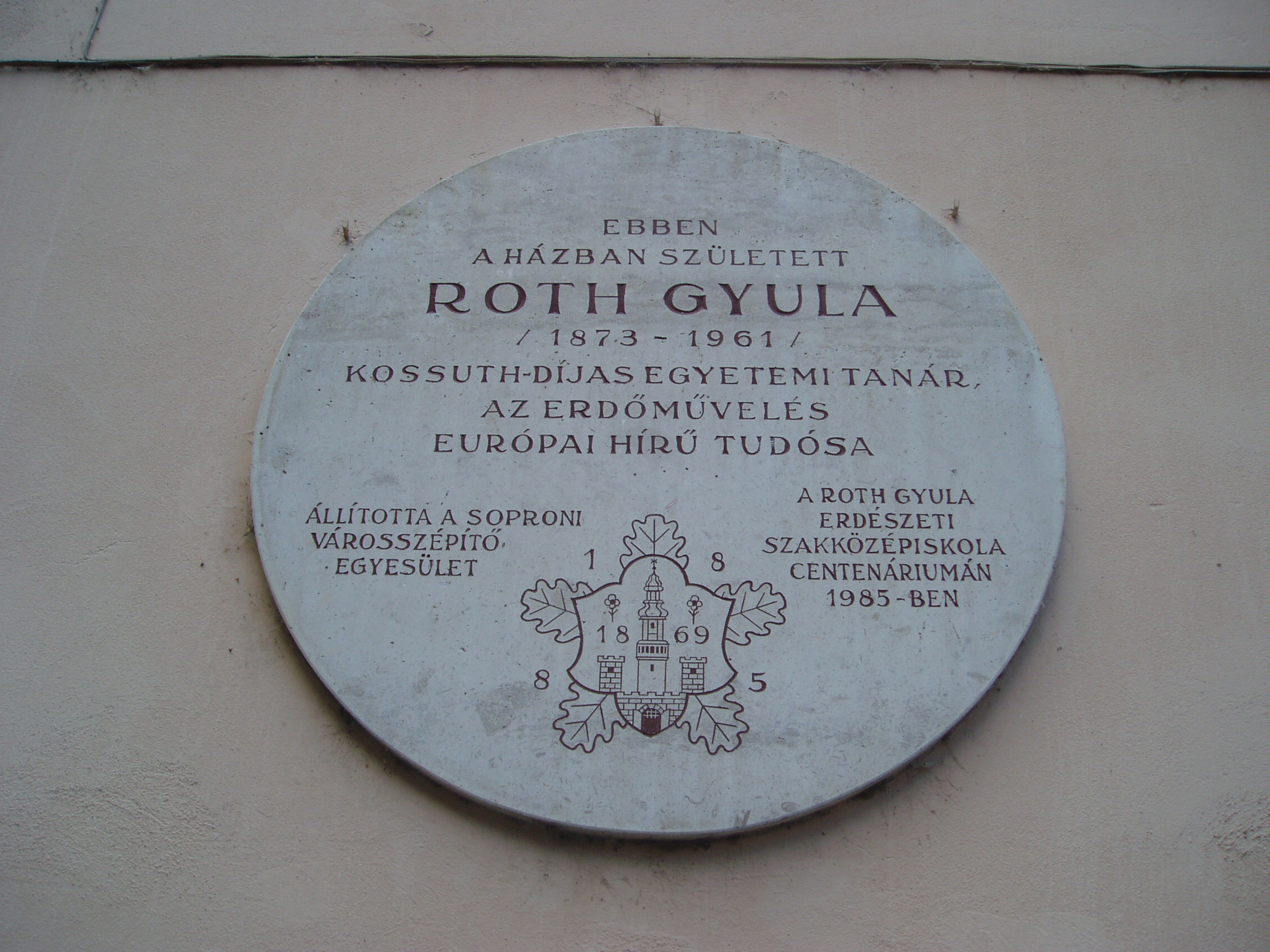 Nyilvános 1064 | 1557 | Sopron, Előkapu 3. | Sopron belvárosának főbejárata az északon nyíló Előkapu. Helye már a római korban lakott volt, majd a középkorban erődítésrendszert alakítottak itt ki. A területet a XVIII. század közepétől kezdték beépíteni lakóházakkal. A homlokzaton elhelyezett emléktábla tanúsága szerint a 3. szám alatt született Roth Gyula (1873-1961) Kossuth-díjas egyetemi tanár, az erdőművelés európai hírű tudósa. A fénykép 2008 júniusában készült. Felh. irod.: Czellár Katalin: Sopron. 3. jav. kiad. Bp. Panoráma, 2000 |