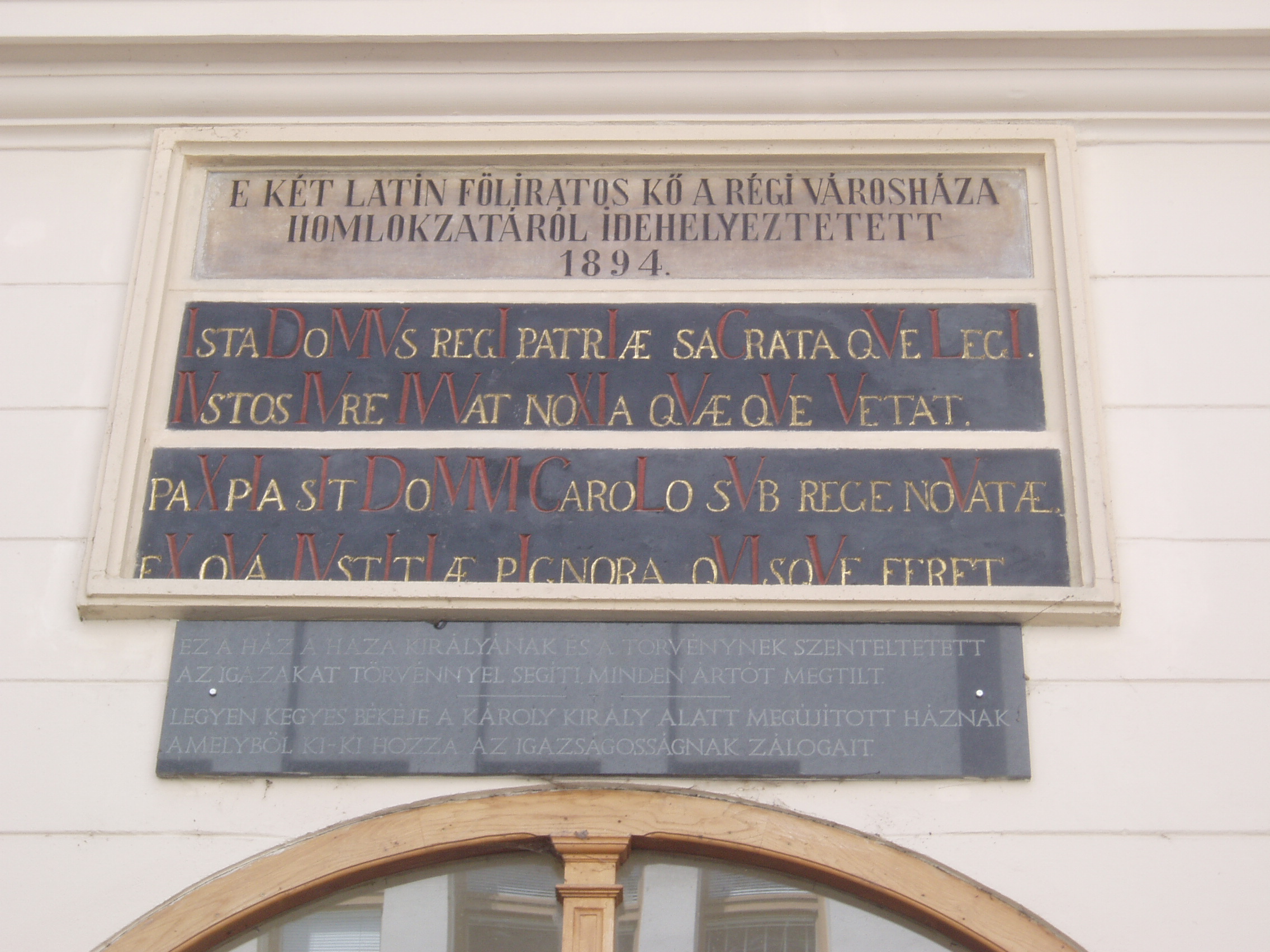 Nyilvános 1021 | 1468 | Sopron, Fő tér 1. Városháza | 1497-től állt ezen a helyen Sopron első számú középülete. Ekkor vásárolta meg és alakíttatta át a város az akkori régi házat. Itt működött a sokoldalú Lackner Kristóf polgármester, aki jeles művészként az épületet kívül és belül festményekkel, feliratokkal díszítette. A mai, eklektikus stílusú városháza az 1890-es évek első felében épült a régi, rossz állapotú középület helyére. Tervezői Hintraeger Mór és fia voltak. A régi városházából két, latin nyelvű feliratot beépítettek az új épületbe. A kép 2008 júniusában készült. Felh. irod.: Czellár Katalin: Sopron. 3. jav. kiad. Bp. Panoráma, 2000 |