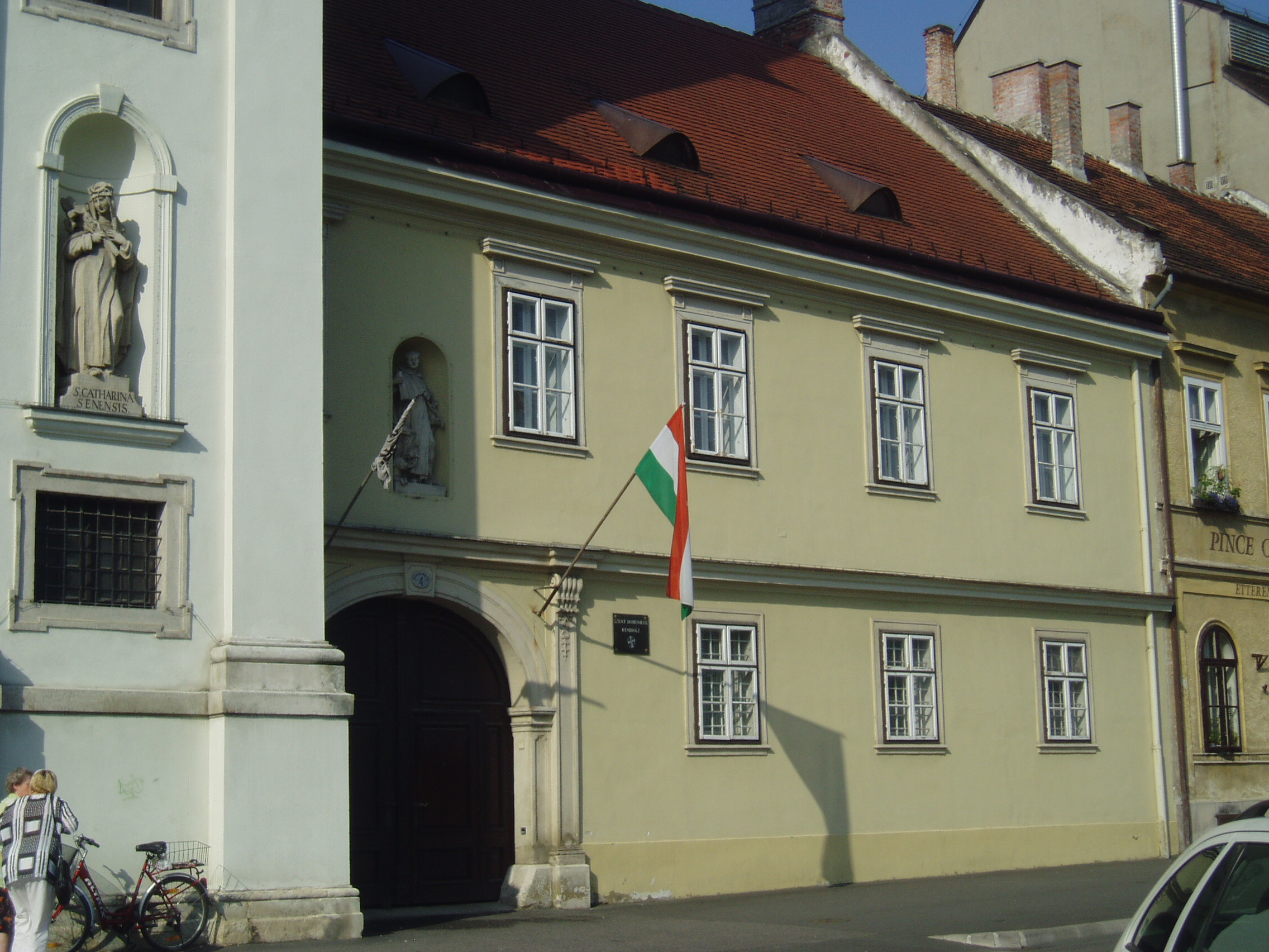 Nyilvános 985 | 1294 | Sopron, Széchenyi tér 4. | A templom mellett álló egyemeletes kolostort 1745-1750 között építették. A félköríves fülkében Szent Domonkos szobra áll. A Domonkos-rendi szerzetesek 1764-ben telepedtek le Sopronban s 1700-ban vásárolták meg a mai templom és a kolostorépület helyén álló két házat. A kép 2008 júniusában készült. Felh. irod.: Czellár Katalin: Sopron. 3. jav. kiad. Bp. Panoráma, 2000 |
