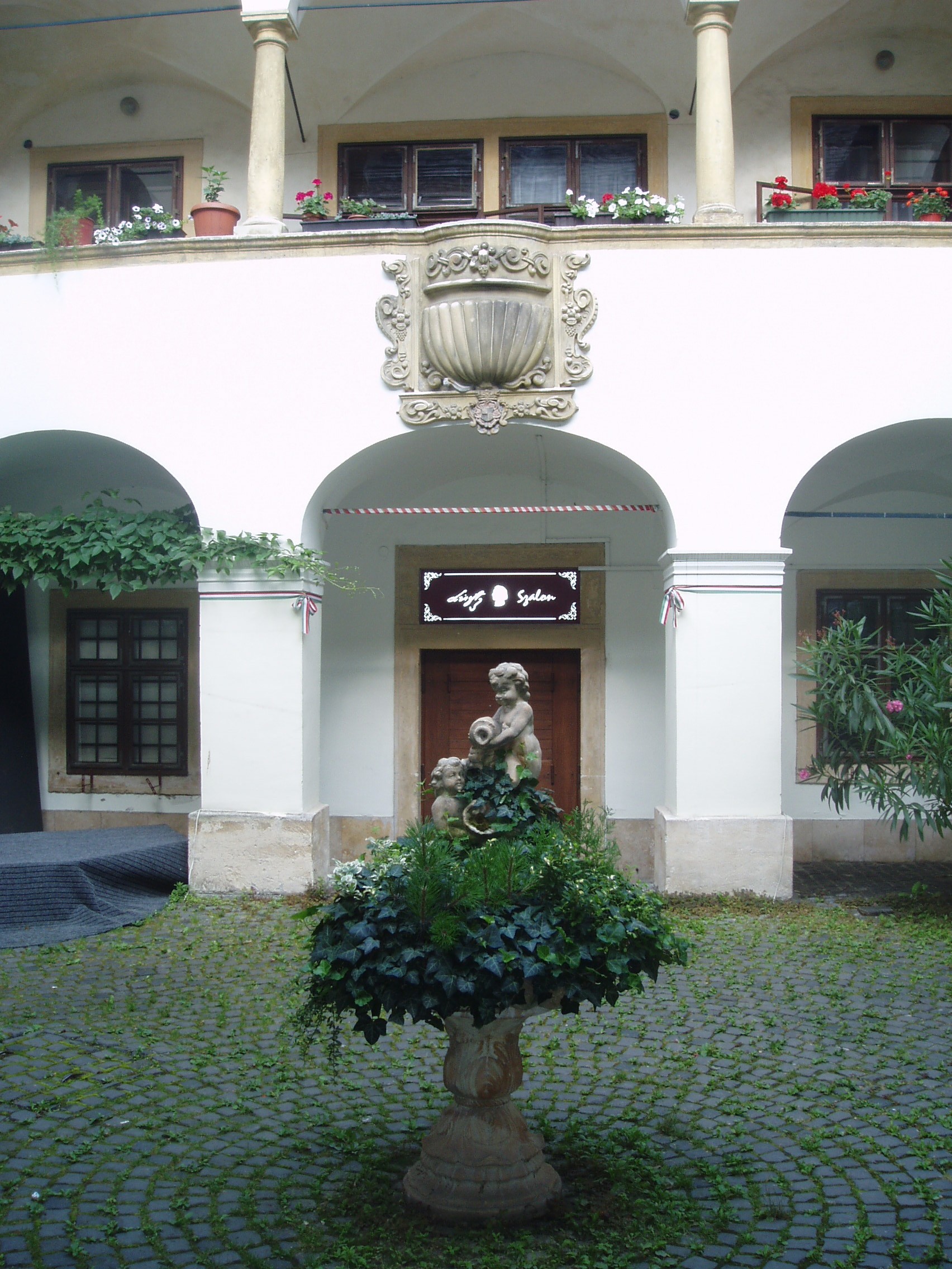 Nyilvános 1024 | 1395 | Sopron, Szent György utca 12. Eggenberg-ház | A XV. századi eredetű, 1674-ben bővített, barokk homlokzatú Eggenberg–ház kapuját a brandenburgi választófejedelem címere díszíti. Udvarán emeleti árkádsor fut körbe. A soproni evangélikusok történetében fontos szerepe volt egykori tulajdonosának, a brandenburgi őrgróf rokonának, Eggenberg hercegnének, aki 1674–76 között engedélyt kapott házában istentiszteletek tartására, ami a Lackner–ház (Fő tér 7.) kivételével tilos volt a városban. Ebből az időszakból maradt meg a kapuval szemközt az épület mellvédjébe épített faragott kő szószék. Alatta ajtó vezet a házban kialakított Liszt szalon helyiségeibe. A kávéházban kiállítás látható a budapesti Liszt Ferenc Emlékmúzeum (lásd: Budapest, VI. Vörösmarty u. 35.) anyagából a Sopronhoz több szállal kötődő Liszt Ferenc életútjáról. Lisztet és körét egy nagyméretű freskó is megidézi a szalon központi helyiségében. A kávéházban rendszeresen koncertekkel és gasztronómiai eseményekkel hódolnak a halhatatlan mester előtt. Az épület előtt járdába ágyazott kis bronztábla jelzi, hogy e hely a soproni Liszt Ferenc sétaút állomása. A közelmúltban jelölték ki azt a virtuális útvonalat, amely Liszt legfontosabb soproni emlékhelyeit köti össze, s melynek további pontjai a következők: Fő tér 8. (Storno–ház), Templom utca 6. (Bezerédj–ház), Petőfi tér 3. (a régi kaszinó), Széchenyi tér 15. (Liszt Ferenc Konferenciaközpont – az egykori új kaszinó, illetve ennek Templom utcai oldalánál álló Liszt–mellszobor). A kép 2008 júniusában készült. Felh. irod.: Czellár Katalin: Sopron. 3. jav. kiad. Bp. Panoráma, 2000 www.lisztfestival.hu |