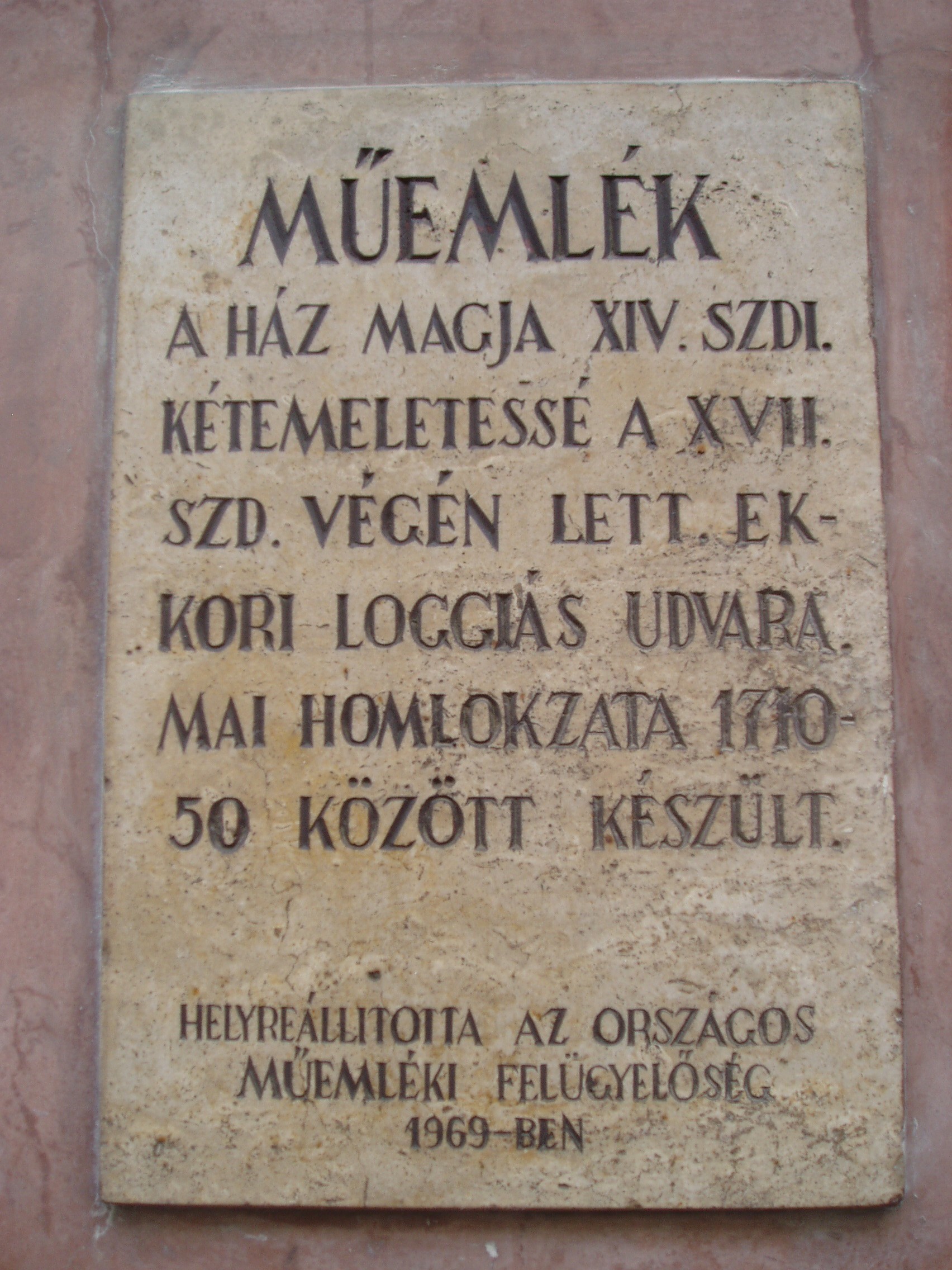 Nyilvános 1021 | 1387 | Sopron, Szent György utca 13. | A XVI. századi házat a XVII. század végén alakították kétemeletessé, ekkor készültek udvarának loggiái is. Homlokzata 1710-1750 között formálódott ki. A folyosó egyes részeinek mennyezetét XVIII. századi stukkók díszítik. Ismert tulajdonosa volt a XVIII. század első felében Csáky generális. A kép 2008 júniusában készült. Felh. irod.: Czellár Katalin: Sopron. 3. jav. kiad. Bp. Panoráma, 2000 |
