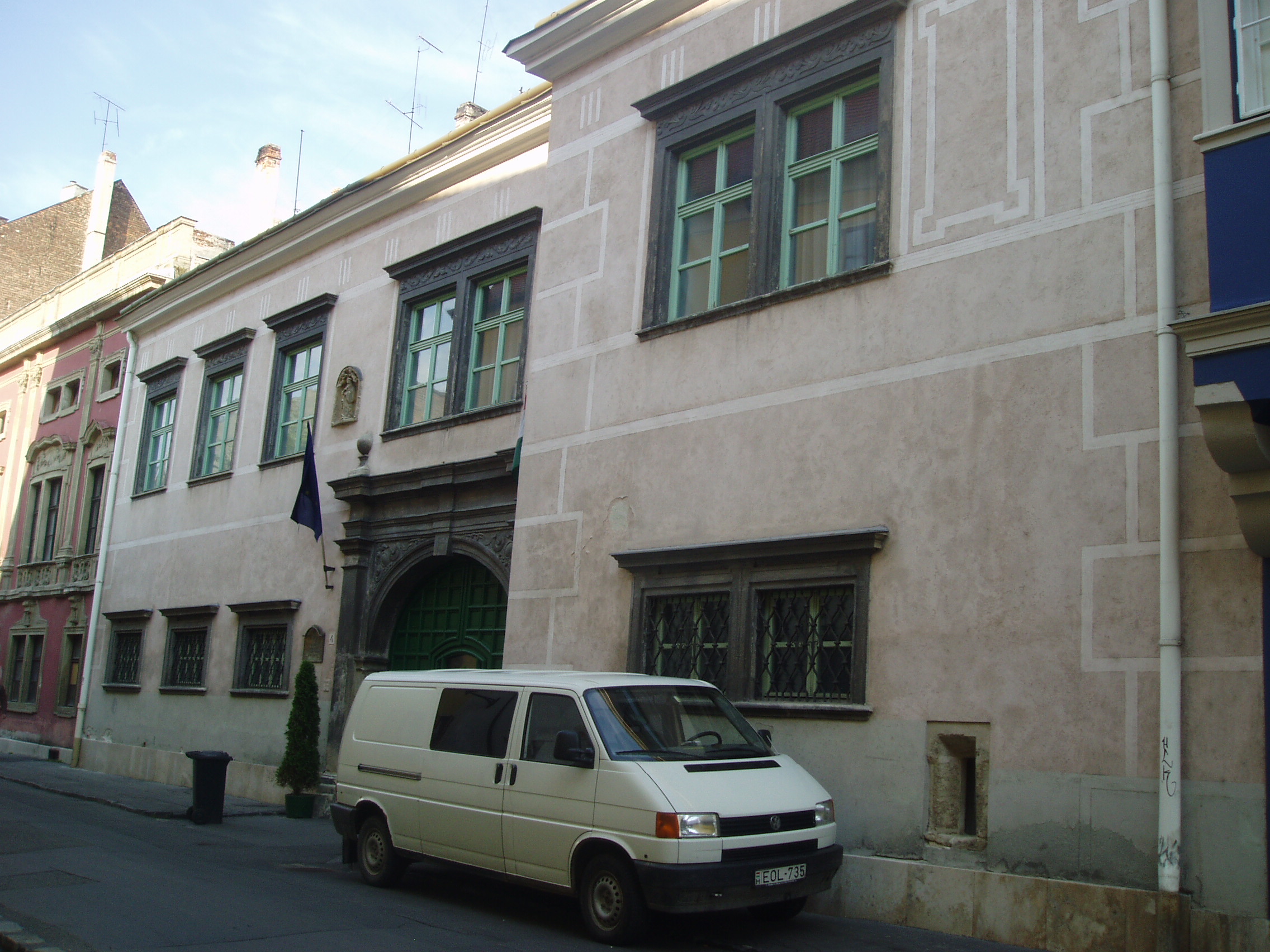 Nyilvános 1005 | 1355 | Sopron, Templom utca 4. Esterházy-palota | A Templom utca 2. számú házhoz hasonlóan ez a középkori eredetű épület is az Esterházy család tulajdona volt 1614-től egészen 1945-ig, előtte pedig Oláh Miklós, a neves humanista érsek családjáé volt. A XVII. századból a kapu és az udvari loggia őrződött meg; homlokzata, amely mintegy folytatása a másik Esterházy–palotának, a XVIII. század közepéről származik. Ebben az épületben állapították meg 1921-ben az antanthatalmak megbízottjai a Sopron és környékének sorsát eldöntő népszavazás eredményét. Az evangélikus templom harangozója hallotta meg elsőként a polgárok közül a jó hírt, s ő kezdte el örömében a harangozást, amihez azután Sopron többi temploma is csatlakozott. A kép 2008 júniusában készült. Felh. irod.: Czellár Katalin: Sopron. 3. jav. kiad. Bp. Panoráma, 2000 |