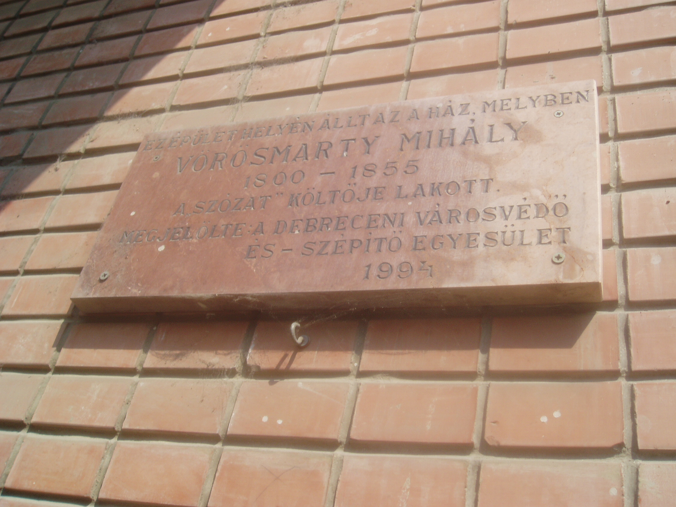 Nyilvános 1415 | 3111 | Debrecen, Csapó utca 16. | Ezen a helyen a középkorban nemesi udvarházak álltak. A helyükre épült - azóta szintén lebontott - egyik házban, a mai 16. házszám alatt lelt otthonra 1849-ben Vörösmarty Mihály (1849 január elejétől kb. fél évig, Buda visszafoglalásáig Debrecen volt a szabadságharc fővárosa). Férje hadbavonulása után ide költözött ideiglenesen Szendrey Júlia is, csecsemő fiával, Petőfi Zoltánnal. Mint Debrecen történelmének egy kutatója megjegyezte, a Csapó utca ebben az időben méltán viselhette volna a "Költők utcája" elnevezést, mert lakott benne Jókai Mór, Vas Gereben és Wachott Sándor is. A mostani házon Vörösmartyra feliratos márványtábla emlékezik. A fénykép 2006 júniusában készült. Felh. irod.: Papp Antal: Debrecen. Bp. Panoráma, 1976 |