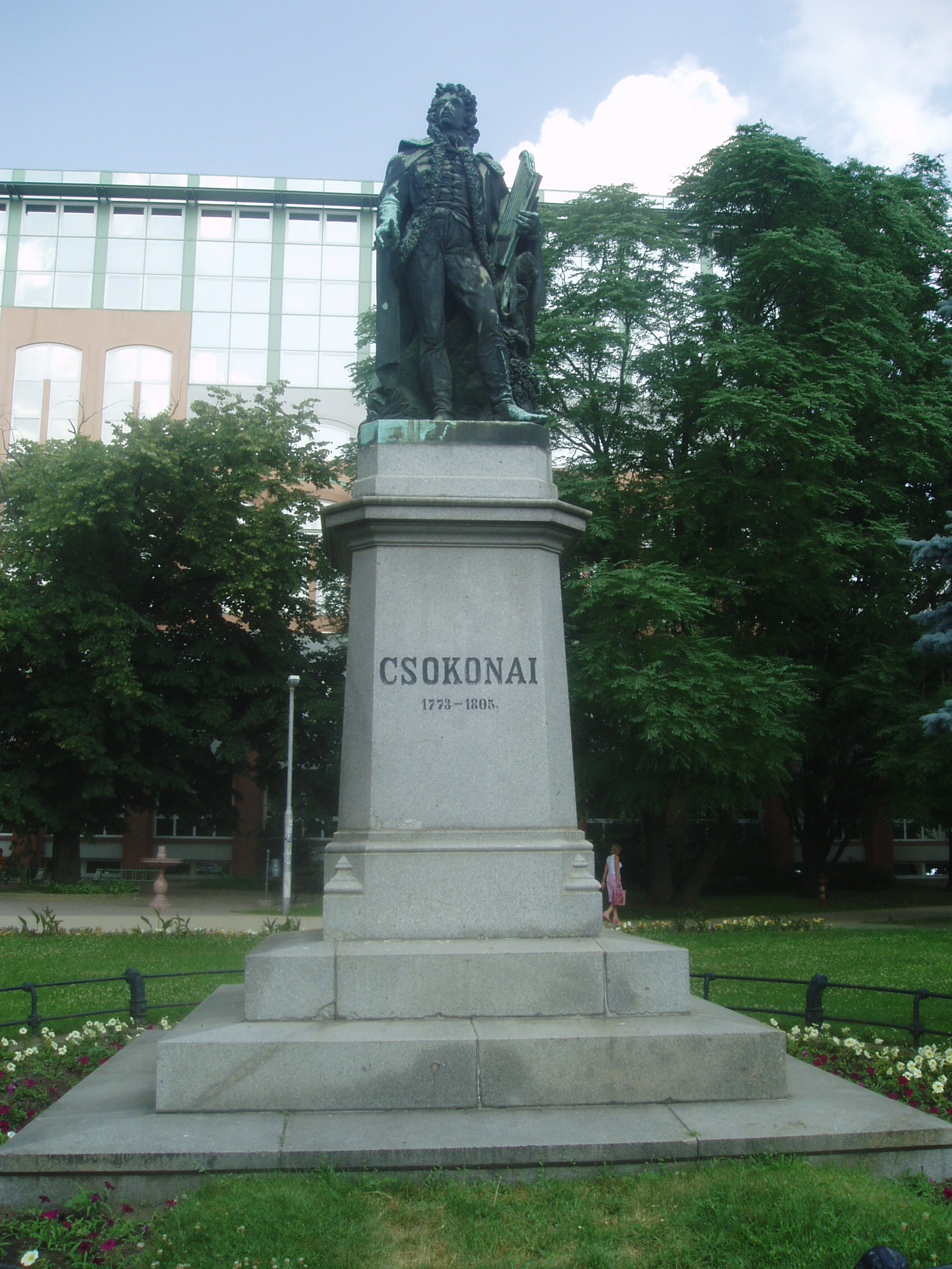Nyilvános 1202 | 2066 | Debrecen, Kálvin tér: Csokonai Vitéz Mihály szobra | A Kálvin tér ékessége Izsó Miklós Csokonai Vitéz Mihályt ábrázoló, 1867-ben készült romantikus szobra. A magas márvány talapzaton álló és arccal a Kollégium felé tekintő szobor szakértői vélemények szerint az egyik legszebb köztéri szobor Magyarországon. A szobor magyaros ruhában, zsinóros mentében, lanttal a kezében, szőlőtőke mellett jeleníti meg az anakreoni dalok költőjét, mintegy az ihlet pillanatában. A művész eredetileg vékonyabb testalkatúnak mintázta Csokonait (ez a gipszvázlat a Kollégiumban található), de a terv nem nyerte el a debreceni cívisek tetszését, mondván, hogy ilyen sovány ember nem élhetett Debrecenben... A fénykép 2006 júniusában készült. Felh. irod.: Papp Antal: Debrecen. Bp. Panoráma, 1976 Kovács Gergelyné: Debrecen. Bp. Panoráma, 1981 |