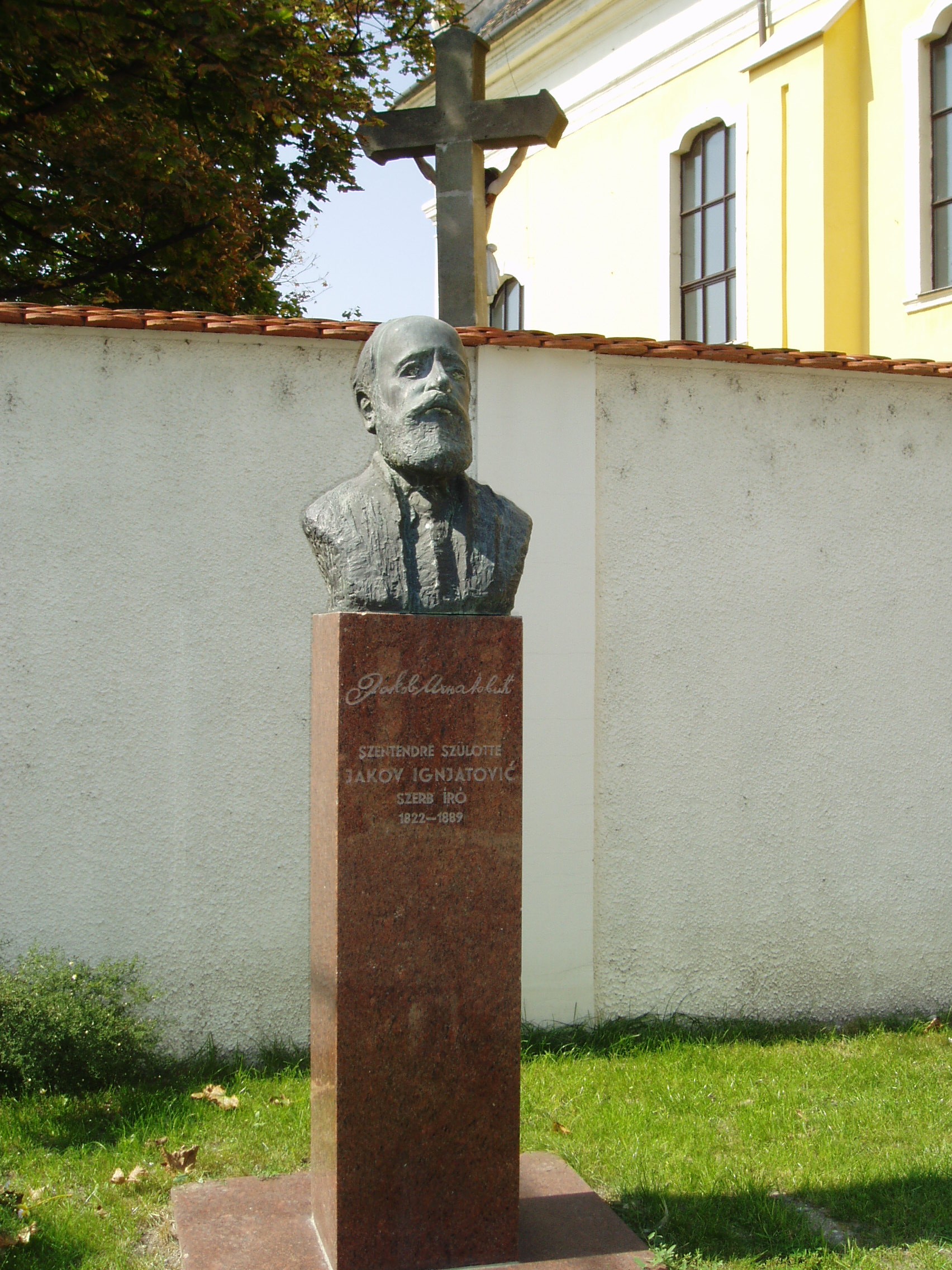 Nyilvános 1101 | 2151 | Szentendre, Ignatovity köz | A szülőháza (lásd: Szentendre, Dumtsa Jenő u. 5/A) melletti kis közt 1958-ban a neves szerb regényíróról, Ignatovity Jakobról nevezték el. Mellszobrát, Janzer Frigyes alkotását 1977-ben helyezték el itt, a Péter-Pál templom előtt. Ignatovity Jakob (1822-1889), a szerb realista regényírás megteremtője. A fiatalember Pesten jogot hallgatott és 1848. március 15-én a Nemzeti Múzeum előtti népgyűlésen a közös forradalom szónoka volt. Társadalmi regényei közül az Örök vőlegény és a Respektus Vásza címűek kötődnek Szentendréhez. Bennük ábrázolja korának és városának szerb nemzetiségű társadalmát. A fénykép 2005 szeptemberében készült. Felh. irod.: Szentendre. Szerk. Sándyné Wolf Katalin. Bp. Panoráma, 1985 |