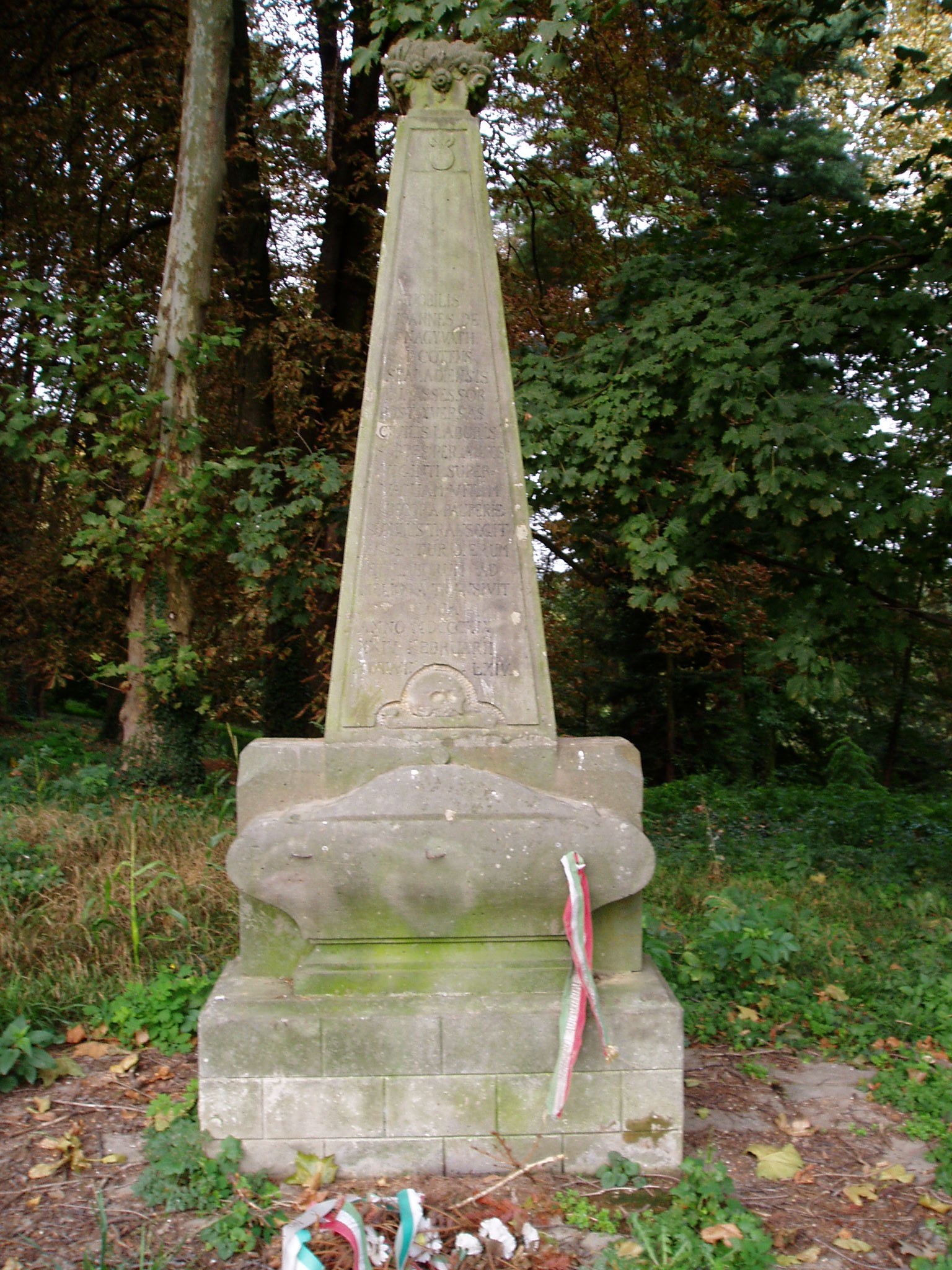 Nyilvános 1771 | 8719 | Csurgó, Széchenyi tér 9. Nagyváthy János sírja | A Csokonai Vitéz Mihály Református Gimnázium és Általános Iskola mai épülete az egykori vadasparkban áll. A nagy kiterjedésű, 4 hektárnyi parkban nyolcvan féle, ritkaságszámba menő növényfaj él. A látogatót együttesen ragadja meg a patinás iskola látványa, a hatalmas ősfák közötti sétányok hangulata és a neves egyéniségek tiszteletére állított emlékek együttese. Nagyváthy János (1755-1819) síremlékét 1939-ben állították fel mai helyén. Nagyváthy a Festetics-uradalom intézője, a keszthelyi Georgikon és a csurgói gimnázium alapításának szorgalmazója, majd a csurgói iskola inspektora volt. Az 1790-es években az ő telkén építették fel a gimnázium első épületét (lásd: Csurgó, Csokonai u. 24.). 1819-ben hunyt el, a házától kb. száz méterre lévő temetőbe temették. Hamvait 1939-ben a Csurgói Öregdiák Szövetség exhumáltatta és síremlékével együtt áthelyezte mai helyére. A síremlék latin nyelvű feliratának magyar fordítása: "Nagyváthy János, Nemes Zala megye Törvényszékének ülnöke, a polgári munka különböző fajai után húsz éven át maradék életét tisztes szegénységben, serényen töltötte el és a napokkal és a fáradalmakkal betelve jobb vidékre költözött az 1819. évben, február 24-én élete 64. évében." A fénykép 2004 októberében készült. Felh. irod.: Horváth József: Csurgó. Műemlékek. Bp. Tájak, Korok, Múzeumok Kiskönyvtára 441. 1982 Csurgói kalauz. Szerk. Terényi Zoltán. 1974 Látnivalók Somogy megyében. Miskolc, Well-PRess Kiadó, 2000 www.vendegvaro.hu |