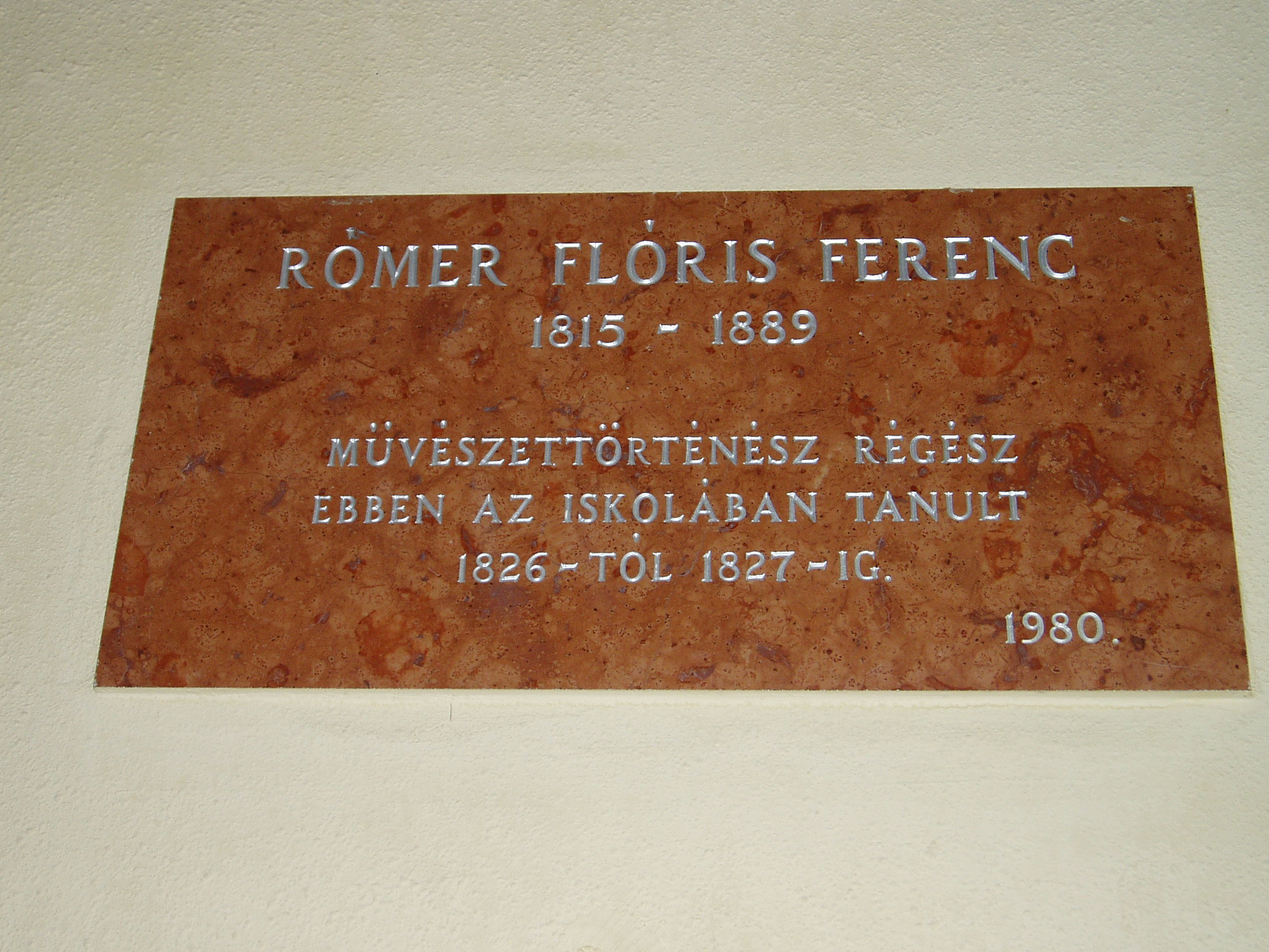 Nyilvános 1388 | 3095 | Tata, Tanoda tér 5. Eötvös József Gimnázium: Rómer Flóris emléktáblája | A tatai gimnáziumot 1765-ben gróf Esterházy Miklós alapította, s vezetésére a piarista tanítórendet kérte fel. Az iskola kezdetben a közeli majki kamalduli szerzetesek többször is átalakított gazdasági épületeiben működött. A jelenlegi iskolaépületet a XX. század elején emelték, 1912-ben kezdődött meg benne a tanítás. Az első emeleti folyosó falán neves egykori tanárok és diákok emléktábláit helyezték el. 11826-1827-ben a tatai gimnázium tanulója volt Rómer Flóris (1815-1889) régész, művészettörténész, egyetemi tanár, akadémikus, a magyar régészettudomány, művészettörténet és műemlékvédelem egyik megteremtője. 1830-ban lett bencés szerzetes. Váradi püspökként halt meg 1889-ben, sírja a nagyváradi székesegyház kriptájában van. A fénykép 2005. júliusában készült. Felh. irod.: www.eotvos-tata.sulinet.hu Wehner Tibor: Tatai szobrok, emlékművek, emléktáblák. Tata, 1980 Száztizenöt éve hunyt el Rómer Flóris. = www. mult-kor.hu 2004. márc. 18. |