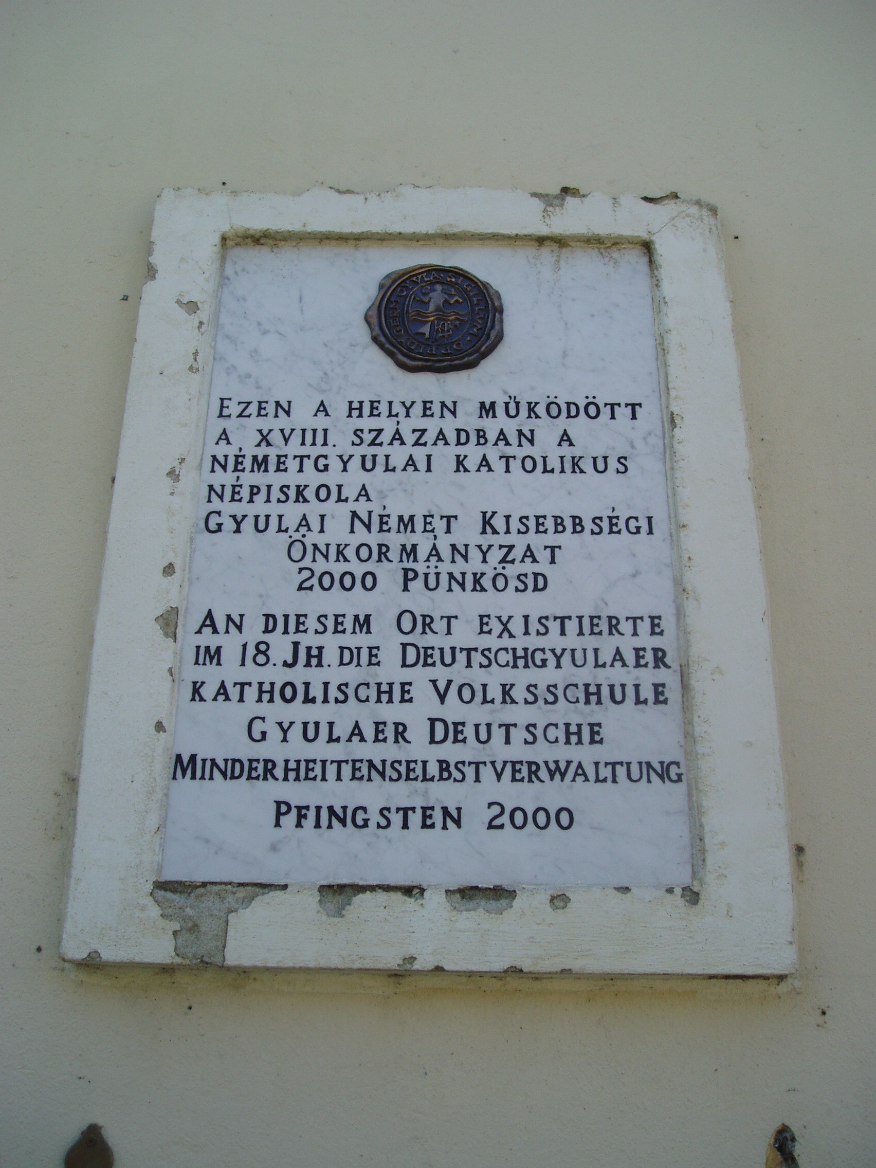 Nyilvános 1361 | 2983 | Gyula, Apor Vilmos tér 1. | Az egykori Németgyula központja az Apor Vilmos mártír püspökről, az egykori gyulai plébánosról elnevezett tér. Meghatározó eleme a közepén álló Szent József-templom, illetve néhány körülötte álló XVIII-XIX. századi épület. Ezek egyike, az egykori németgyulai városháza látható a képen. Régebbi szárnya 1820 körül épült klasszicista stílusban, s 1857-ig ebben működött a városháza. A bal oldali klasszicizáló szárnyat 1874-ben toldották hozzá. Gyula és Németgyula egyesítése óta iskola működik benne. A bejárat mellett emléktábla jelzi, hogy itt, a tanítói lakban született dr. Scherer Ferenc (1889-1987), Gyula városának monográfusa, mely mindmáig az egyik legjobb magyarországi városmonográfia. A másik, kétnyelvű emléktáblát a gyulai németek betelepítésének 270. évfordulója alkalmából helyezték el 1994-ben. A fénykép 2007 júliusában készült. Felh. irod.: Czeglédi Imre: Gyula útikalauz. 2. bőv. kiad. Gyula, 1995 |