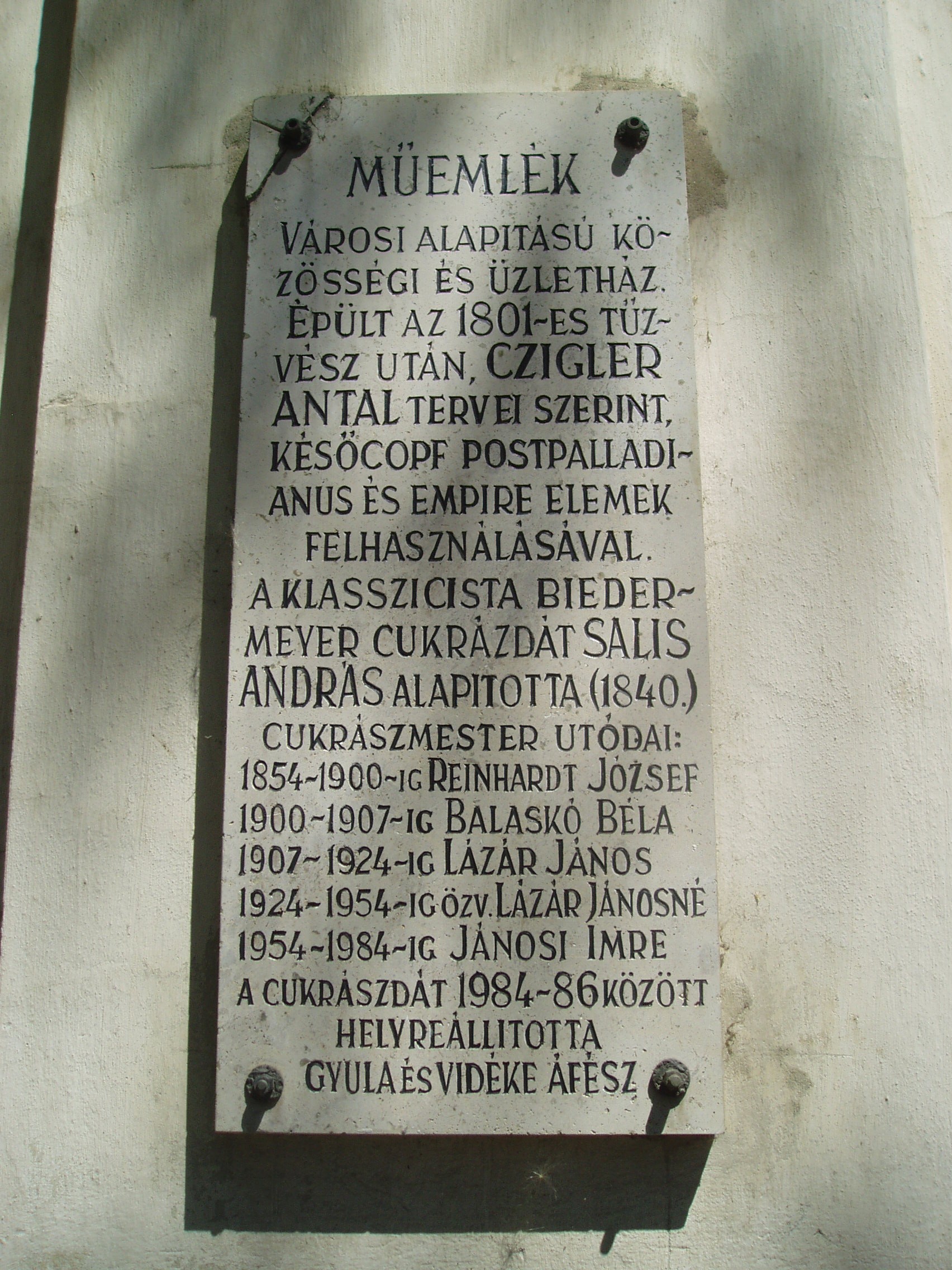 Nyilvános 1364 | 2863 | Rövid leírás | Teljes leírás (1.04 KB) | Gyula, Erkel tér 1. Százéves cukrászda 1801-ben, a nagy tűzvész után épült az egyemeletes, L alakú, műemlékké nyilvánított ház. Erkel térre néző oldala copf- és empire stílusú, a Jókai utca felőli részen klasszicista elemek is felfedezhetők. Műemléki megítélés szerint "korát és színvonalát tekintve a Dél-Alföld legértékesebb emeletes polgárháza". Földszintjén található a megye legrégibb, s az ország egyik legnevezetesebb műemléki cukrászdája, mely bizonyíthatóan legalább 1840 óta fennáll. XIX. századi tulajdonosáról eredetileg Reinhardt-cukrászdának nevezték. A cukrászda elkerülte az államosítást, megőrizték régi berendezését, s a helyiségek reformkori hangulatát. Az udvar felőli folyosón az egykori szabadkéményes cukrászműhely felszereléseit, eszközeit bemutató kiállítás látható. A fénykép 2007 júliusában készült. Felh. irod.: Czeglédi Imre: Gyula útikalauz. 2. bőv. kiad. Gyula, 1995 |