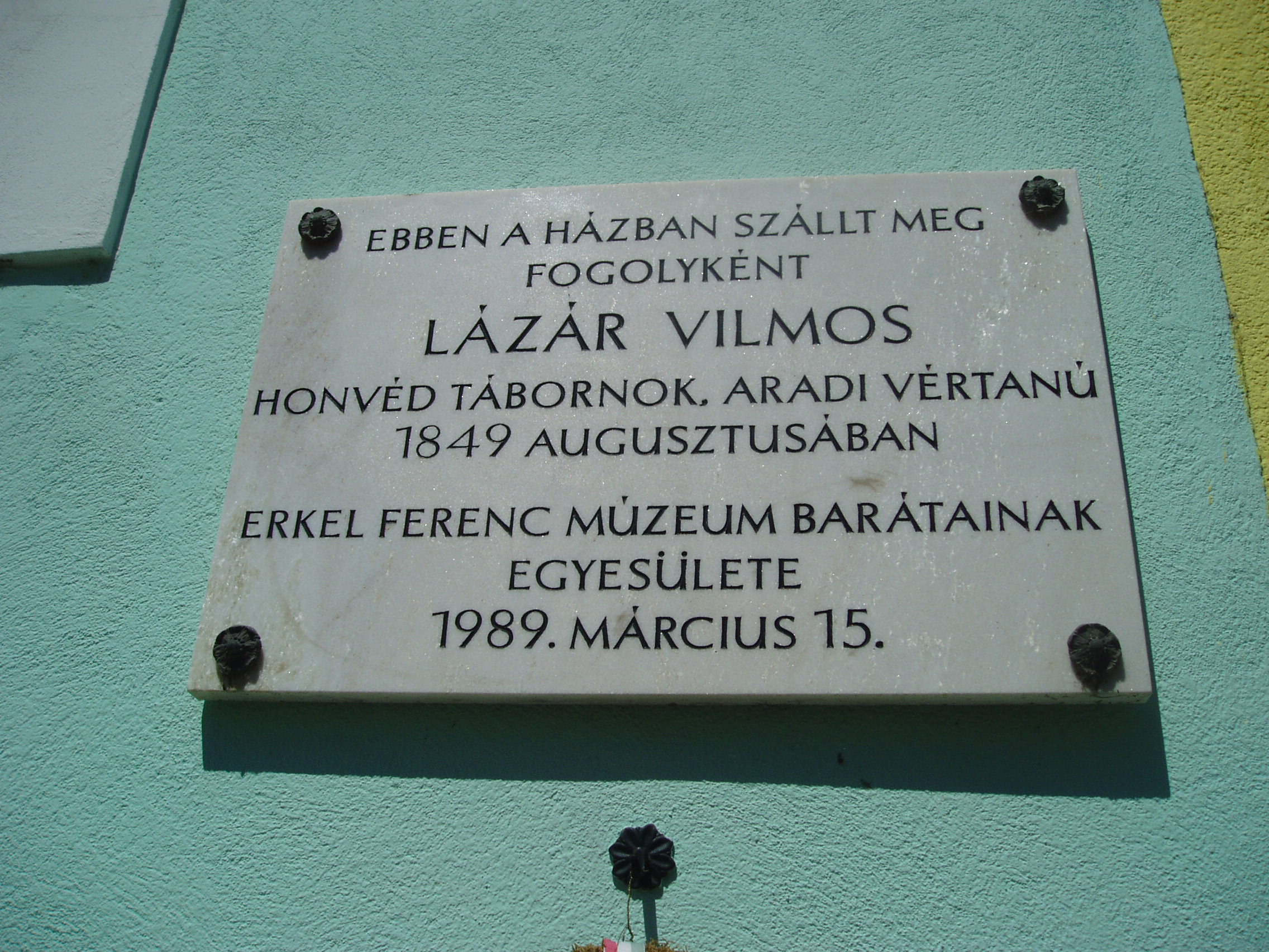 Nyilvános 975 | 1556 | Gyula, Kossuth utca 18. | 1849 augusztusában ebben a lakóházban szállt meg fogolyként Lázár Vilmos honvéd ezredes, aradi vértanú. A szabadságharc tragikus gyulai eseményét lásd: Gyula, Várkert: Honvédtiszti emlékhely. A fénykép 2007 júliusában készült. Felh. irod.: Czeglédi Imre: Gyula útikalauz. 2. jav., bőv. kiad. Gyula, 1995 |