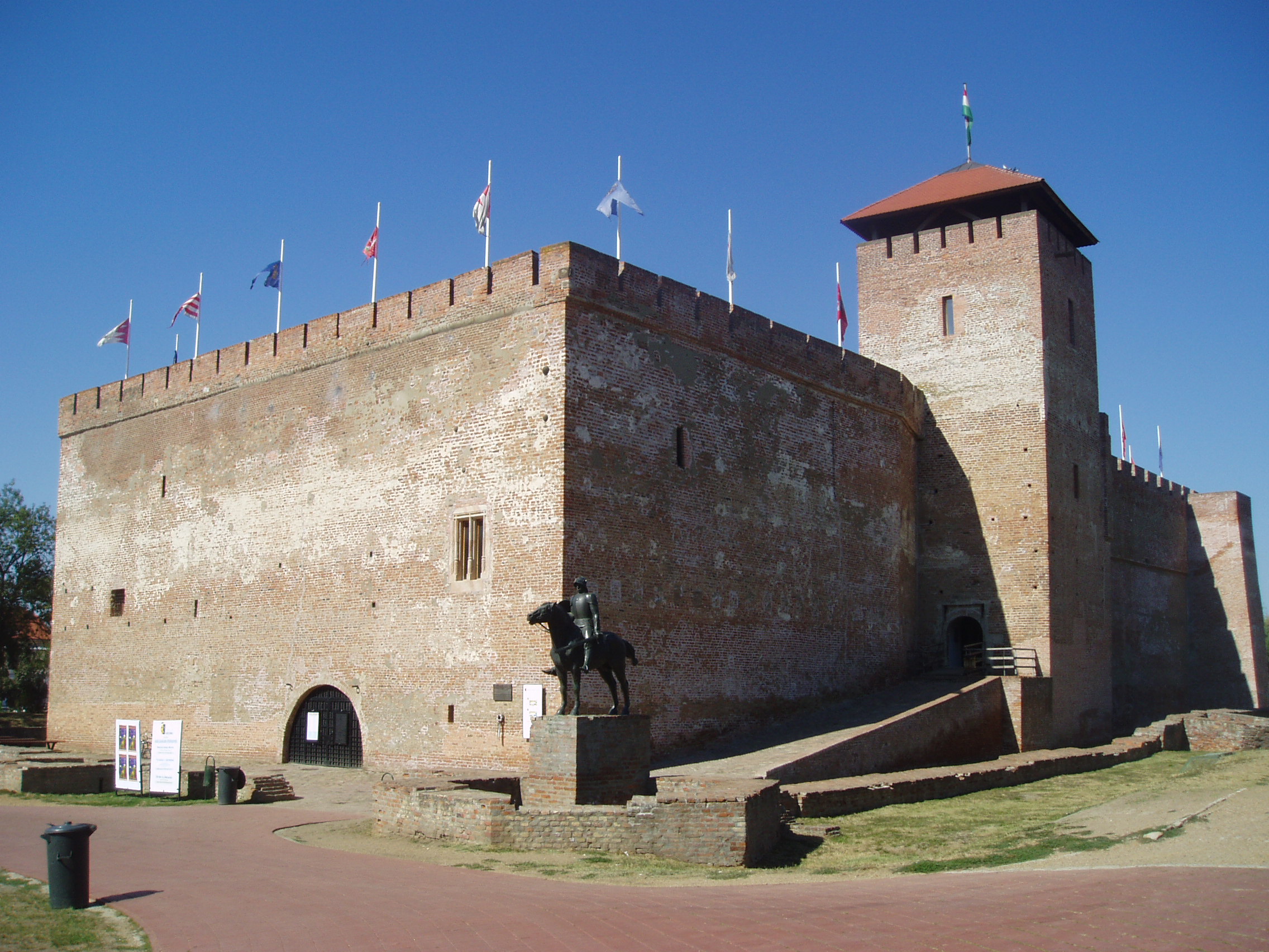Nyilvános 1007 | 1476 | Gyula, Vár | Az Alföld egyetlen középkori téglavárát a Maróthy család építtette a XV. század első felében. Derékvárának saroktornyát 1482 után Corvin János emeltette (ma eszpresszó és borozó működik benne). Corvin János, mint a trónöröklésből kiszorított herceg 1482 és 1504 között volt a vár ura, s feleségével, Frangepán Beatrix-szel együtt gyakran tartózkodott itt. Corvin János 150-ben bekövetkezett halála után özvegye állandóan Gyulán lakott. 1508-ban itt halt meg leánya, Corvin Erzsébet, a Hunyadi család utolsó sarja. 1543-ban a vár történelmi esemény színhelye volt: itt tartott közös országgyűlést Fráter György elnökletével az Erdéllyel határos nyolc alföldi megye nemessége. 1552-től a vár a török elleni végvári rendszer láncszeme lett és ó-olasz bástyás palánkvárrá alakították át. 1566-ban került török kézre, miután erősítés hiányában, kilenc heti ostrom után Kerecsényi László kapitány kénytelen volt feladni. Bár a török szabad elvonulást ígért, a maradék védőket a janicsárok megtámadták és lemészárolták, Kerecsényi kapitányt pedig foglyul ejtették és Nándorfehérváron kivégezték. A vár 1695-ig volt török kézen. Akkori állapotát megörökítette leírásában Evlia Cselebi török világutazó. A Rákóczi-szabadságharc után az ún. huszárvárat lerombolták, csak a belső vár maradt meg. Az épület déli sarkán Tóth Béla: Végvári vitéz című lovas szobra áll. A vár két bejárata közül a délkeleti oldalon van az ún. Kerecsényi kapu. A boltíve alatti két helyiségben a helyi hagyomány szerint Damjanich János és Lahner György tábornok volt elszállásolva 1849 augusztusában. A várudvar 1964 óta a Gyulai Várszínház előadásainak színhelye. A belső termekben a közelmúltban nyílt meg a Vármúzeum. A vár előtt az egykori vizesárok kiszélesítésével csónakázótavat létesítettek, melynek közepén tószínpadot alakítottak ki. A fénykép 2007 júliusában készült. Felh. irod.: Czeglédi Imre: Gyula útikalauz. 2. jav., bőv. kiad. Gyula, 1995 www.vendegvaro.hu www.gyula.hu |