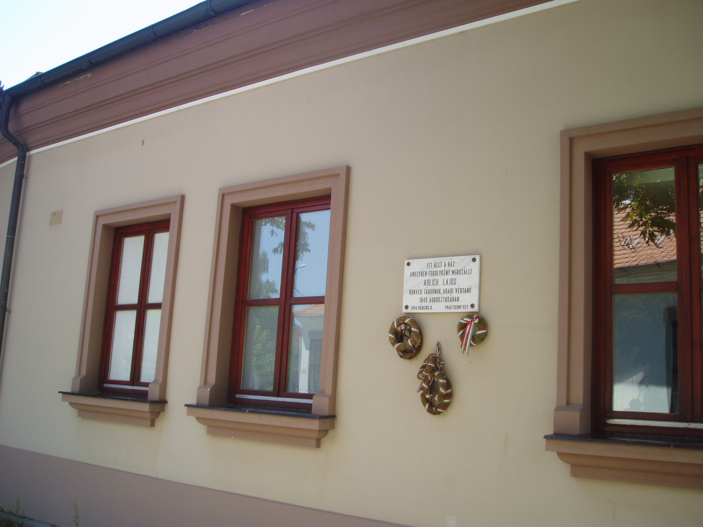 Nyilvános 1056 | 1521 | Gyula, Városház utca 23. | A lakóházat 1994-ben eredeti formájában építették újjá. 1849 augusztusában itt szállt meg Aulich Lajos honvéd tábornok. A szabadságharc tragikus gyulai eseményét lásd: Gyula, Várkert: Honvédtiszti emlékhely. A fénykép 2007 júliusában készült. Felh. irod.: Czeglédi Imre: Gyula útikalauz. 2. jav., bőv. kiad. Gyula, 1995 |