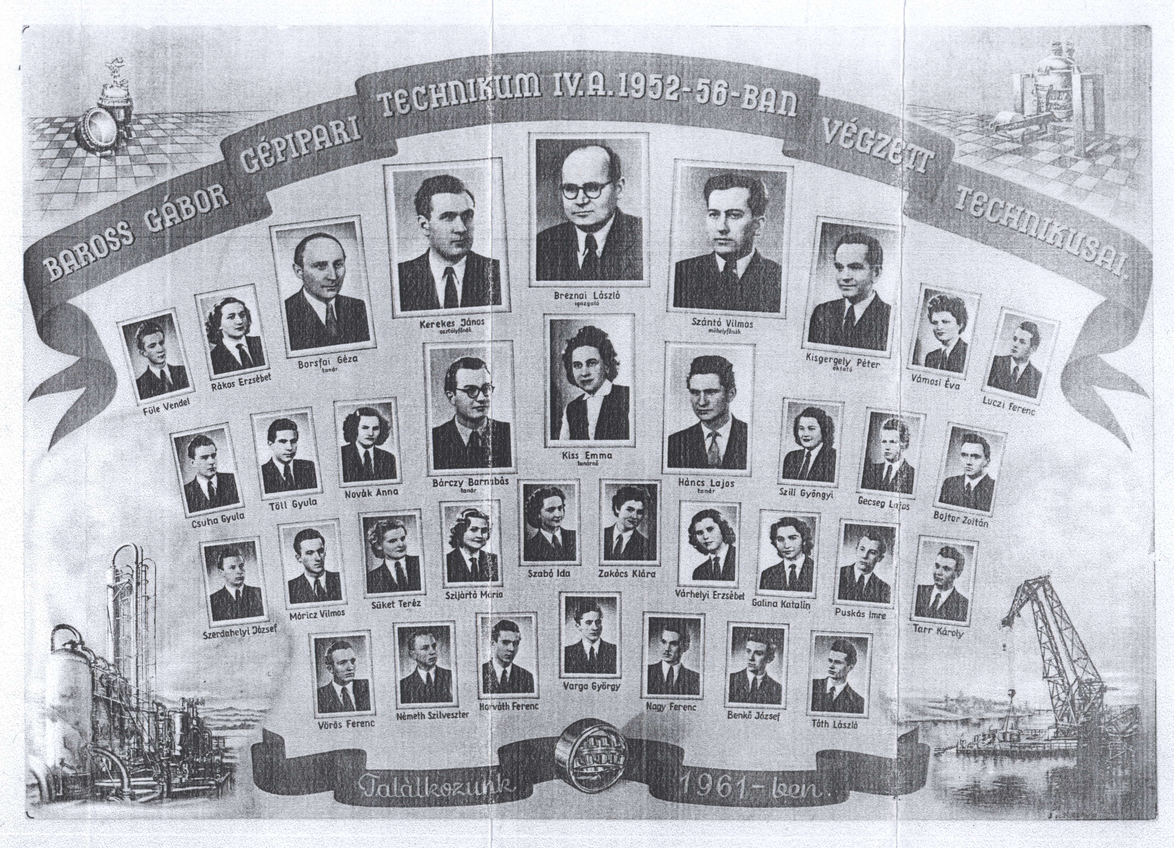 Nyilvános 1385 | 2528 | Baross Gábor Gépipari Technikum IV.A. 1952-56-ban végzett technikusai | Bárczy Barnabás tanár Borsfai Géza tanár Breznai László igazgató Háncs Lajos tanár Kerekes János osztályfőnök Kisgergely Péter oktató Kiss Emma tanárnő Szántó Vilmos műhelyfőnök Benkő József Bojtor Zoltán Csuha Gyula Füle Vendel Galina Katalin Gecseg Lajos Horváth Ferenc Luczi Ferenc Móricz Vilmos Nagy Ferenc Németh Szilveszter Novák Anna Puskás Imre Rákos Erzsébet Süket Teréz Szabó Ida Szerdahelyi József Szijártó Mária Szili Gyöngyi Tarr Károly Tóth László Töll Gyula Vámosi Éva Varga György Várhelyi Erzsébet Vörös Ferenc Zakócs Klára |