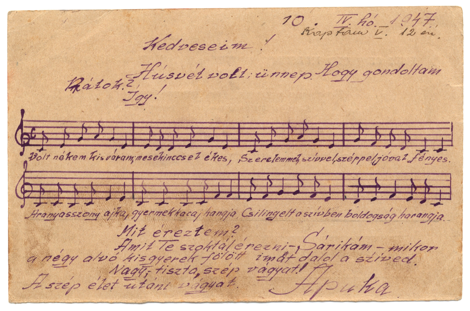 Nyilvános 1305 | 2248 | Vértes Imréné | Letenye IV. - Zala vm. Magyarország Vértes Imre hdgy. C.C.C.P. "Moszkva" Vöröskereszt, Postafiók 430/1. c. 10. IV. hó 1947. (Kaptam V. 12-én) Kedveseim! Húsvét volt, ünnep. Hogy gondoltam Rátok? Így! Volt nékem kis váram, mesekinccsel ékes, Szerelemmel, szívvel, széppel, jóval fényes. Aranyasszony ajka, gyermekkacaj hangja Csilingelt a szívben boldogság harangja. Mit éreztem? Amit Te szoktál érezni-, Sárikám - mikor a négy alvó kisgyerek fölött imát dalol a szíved. Nagy, tiszta, szép vágyat! A szép élet utáni vágyat. Apuka |