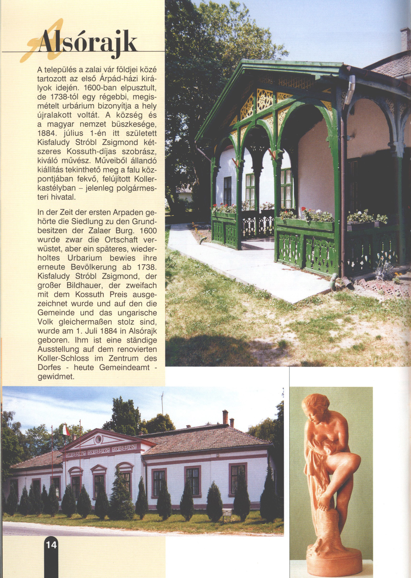 Nyilvános 2062 | 6040 | Rövid leírás | Teljes leírás (1.21 KB) | Alsórajk In der Zeit der ersten Arpaden gehörte die Siedlung zu den Grundbesitzen der Zalaer Burg. 1600 wurde zwar die Ortschaft verwüstet, aber ein späteres, wiederholtes Urbarium bewies ihre erneute Bevölkerung ab 1738. Kisfaludy Stróbl Zsigmond, der großer Bildhauer, der zweifach mit dem Kossuth Preis ausgezeichnet wurde und auf den die Gemeinde und das ungarische Volk gleichermaßen stolz sind, wurde am 1. Juli 1884 in Alsórajk geboren. Ihm ist eine ständige Ausstellung auf dem renovierten Koller-Schloss im Zentrum des Dorfes - heute Gemeindeamt -gewidmet. Dieses Text stammt von: Titel: Hívogató a Régiók Kapujában - Útikönyv Látnivalók Nagykanizsán és Térségében (Einladend in dem Tor des Gebiets - Reisebuch - Sehenswürdigkeiten in Nagykanizsa und Umgebung) Herausgegeben von: Nagykanizsa és a Környező Települések Területfejlesztési Társulása (Verein für Gebietsentwicklung in Nagykanizsa und in ihrer Umgebung) 8800 Nagykanizsa, Petőfi Sándor út 5. Tel.: 06 93/536-453 • 06 93/536-454 Tel ./Fax: 06 93/326-323 E-mail: terstars@axelero.hu www.kanizsaterseg.celodin.hu |