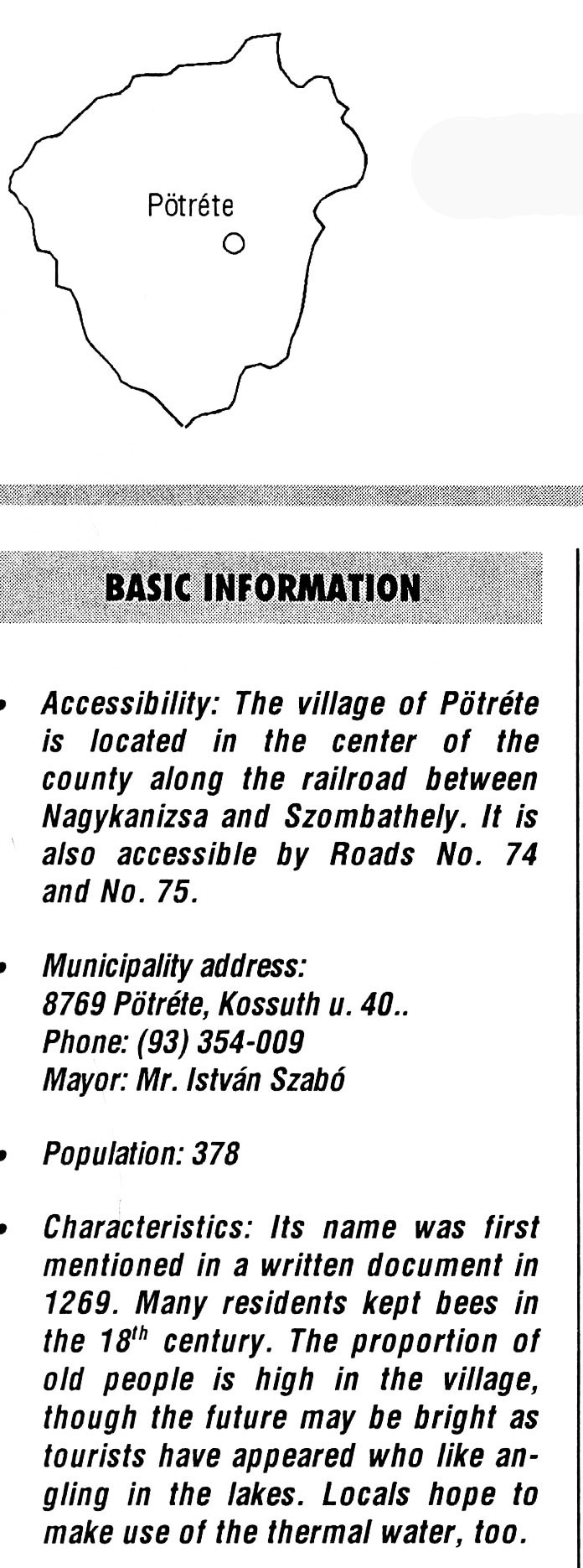 Nyilvános 2257 | 5734 | Pötréte | BASIC INFORMATION Accessibility: The village of Pötréte is located in the center of the county along the railroad between Nagykanizsa and Szombathely. It is also accessible by Roads No. 74 and No. 75. Municipality address: 8769 Pötréte, Kossuth u. 40. Phone: (93) 354-009 Mayor: Mr. István Szabó Population: 378 Characteristics: Its name was first mentioned in a written document in 1269. Many residents kept bees in the 18th century. The proportion of old people is high in the village, though the future may be bright as tourists have appeared who like angling in the lakes. Locals hope to make use of the thermal water, too. This text came from the following book: Title: Handbook of Zala county (Zala megye kézikönyve) Series: County handbooks of Hungary (Magyarország megyei kézikönyvei) Chief editor: Hóbor József Publisher: (Hatvan), CEBA-Hungary Ltd, 1998 ETO: 908.439.121(035) ; 050.8(439.121) ISBN: 963-9089-18-2 Pages: 488-1040 p. Remark: Closed on: 1998. márc. 31. |