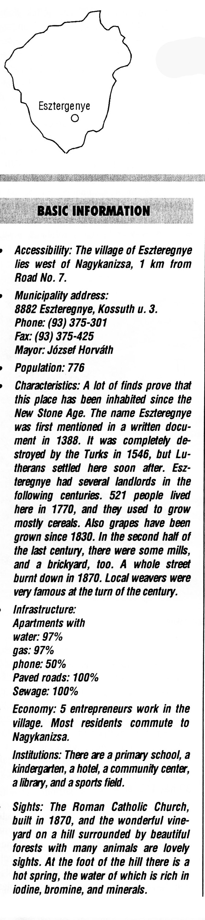 Nyilvános 2462 | 9180 | Eszteregnye | BASIC INFORMATION Accessibility: The village of Eszteregnye lies west of Nagykanizsa, 1 km from Road No. 7. Municipality address: 8882 Eszteregnye, Kossuth u. 3. Phone: (93) 375-301 Fax: (93) 375-425 Mayor: József Horváth Population: 776 Characteristics: A lot of finds prove that this place has been inhabited since the New Stone Age. The name Eszteregnye was first mentioned in a written document in 1388. It was completely destroyed by the Turks in 1546, but Lutherans settled here soon after. Eszteregnye had several landlords in the following centuries. 521 people lived here in 1770, and they used to grow mostly cereals. Also grapes have been grown since 1830. In the second half of the last century, there were some mills, and a brickyard, too. A whole street burnt down in 1870. Local weavers were very famous at the turn of the century. Infrastructure: Apartments with water: 97% gas: 97% phone: 50% Paved roads: 100% Sewage: 100% Economy: 5 entrepreneurs work in the village. Most residents commute to Nagykanizsa. Institutions: There are a primary school, a kindergarten, a hotel, a community center, a library, and a sports field. Sights: The Roman Catholic Church, built in 1870, and the wonderful vineyard on a hill surrounded by beautiful forests with many animals are lovely sights. At the foot of the hill there is a hot spring, the water of which is rich in iodine, bromine, and minerals. This text came from the following book: Title: Handbook of Zala county (Zala megye kézikönyve) Series: County handbooks of Hungary (Magyarország megyei kézikönyvei) Chief editor: Hóbor József Publisher: (Hatvan), CEBA-Hungary Ltd, 1998 ETO: 908.439.121(035) ; 050.8(439.121) ISBN: 963-9089-18-2 Pages: 488-1040 p. Remark: Closed on: 1998. márc. 31. |